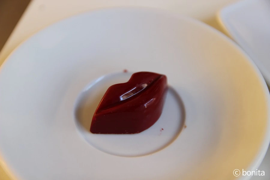 달콤한 케이크 한 조각과 초콜릿 하나를 집는다.