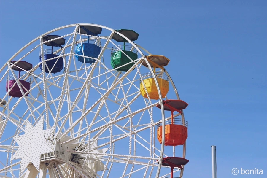 색색깔의 의자를 실은 새하얀 관람차가 커다란 원을 그리며 돌아간다.