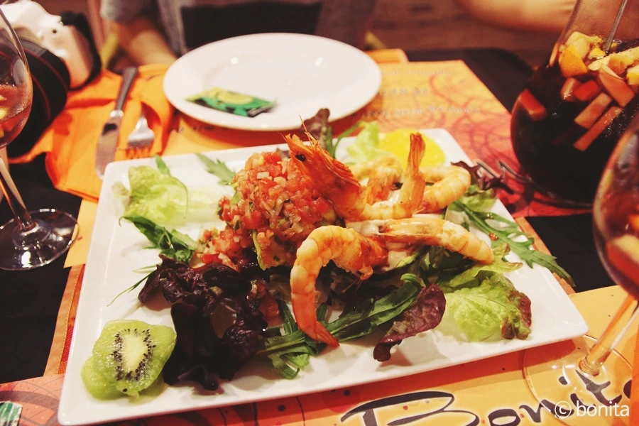 과카몰레가 얹어진 아보카도와 감바스가 조화를 이루는 에피타이저를 하나 시켜두고