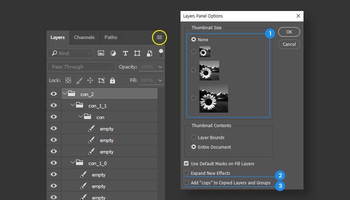 2. 레이어 스타일을 적용할 때, 자동으로 스타일을 펼쳐줄지 여부를 설정한다. 기본값은 체크되어있는데 해제한다. 필요할 때 열면 되니까.