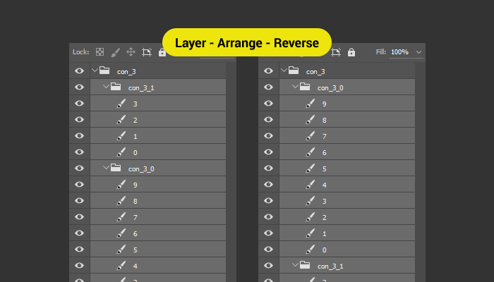 메뉴에서 Layer - Arrange - Reverse를 누르면 선택한 그룹 및 레이어의 순서가 뒤집힌다.