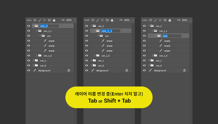 레이어 이름을 수정 후, Enter나 Click 등으로 마무리 짓지 않고 해당 키를 누르면 위/아래로 옮겨가며 이름을 수정할 수 있다. 단, 숨겨진 레이어는 건너뛴다. Tab은 아래로 Shift + Tab은 위로 이동한다.