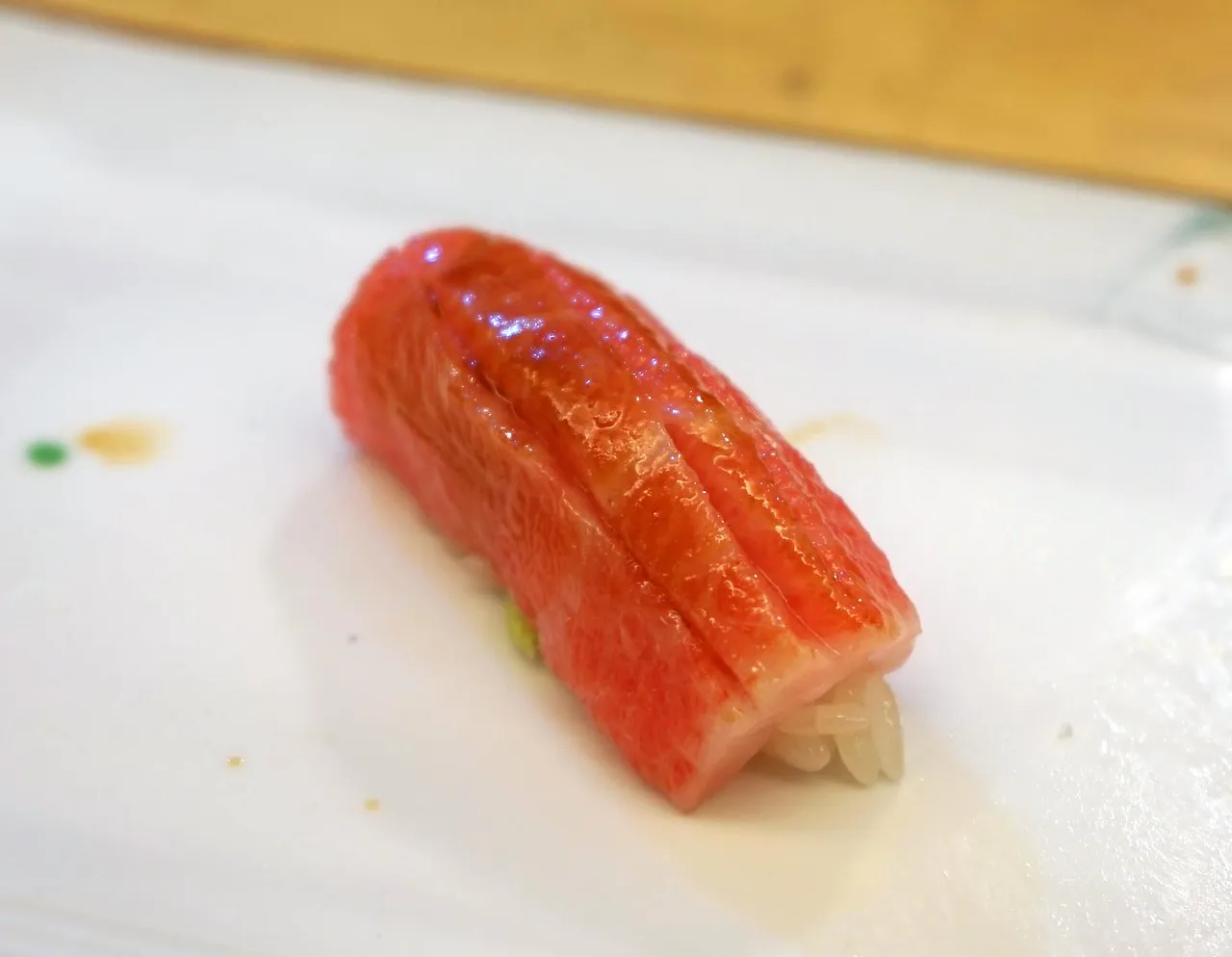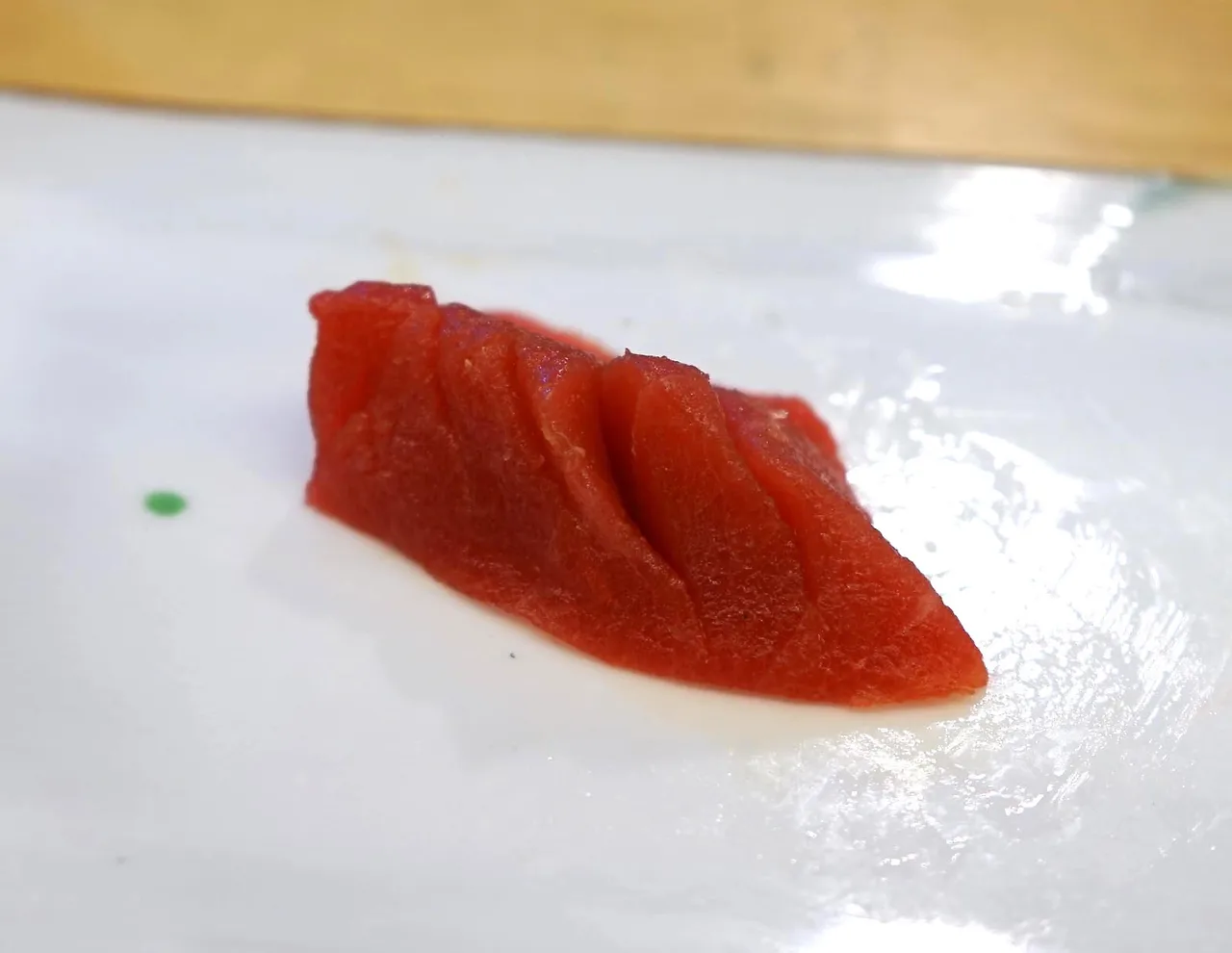 아까미즈케. 참치 등살을 간장 등의 소스에 넣고 절였다. 개인적으로 참 좋아하는 스시.