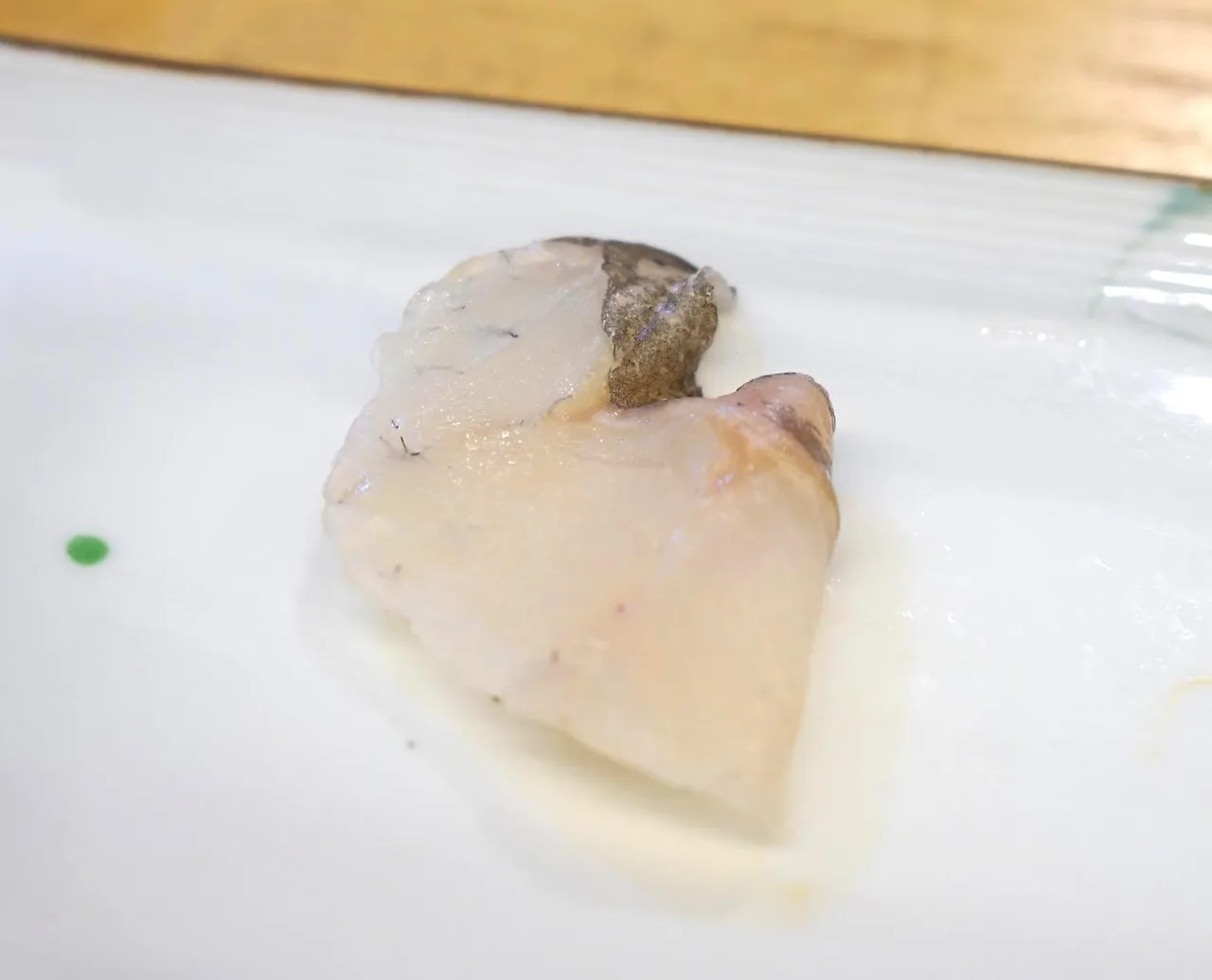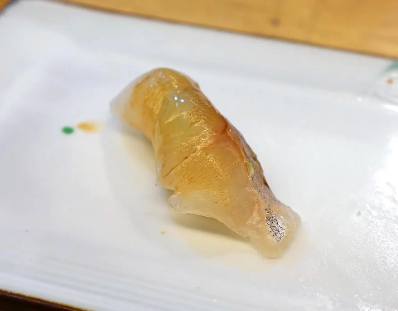 야리이까(한치). 유자를 갈아 얹었다. 가만히 보니 내 옆에 비슷한 시간대에 식사를 시작한 손님들이 있는데, 코우지 셰프는 굳이 스시를 내는 타이밍을 나와 달리 해서 준다. 한꺼번에 내도 될 것 같은데... 손님이 식사를 하는 속도 등 디테일에 신경을 많이 쓰는 느낌이다.