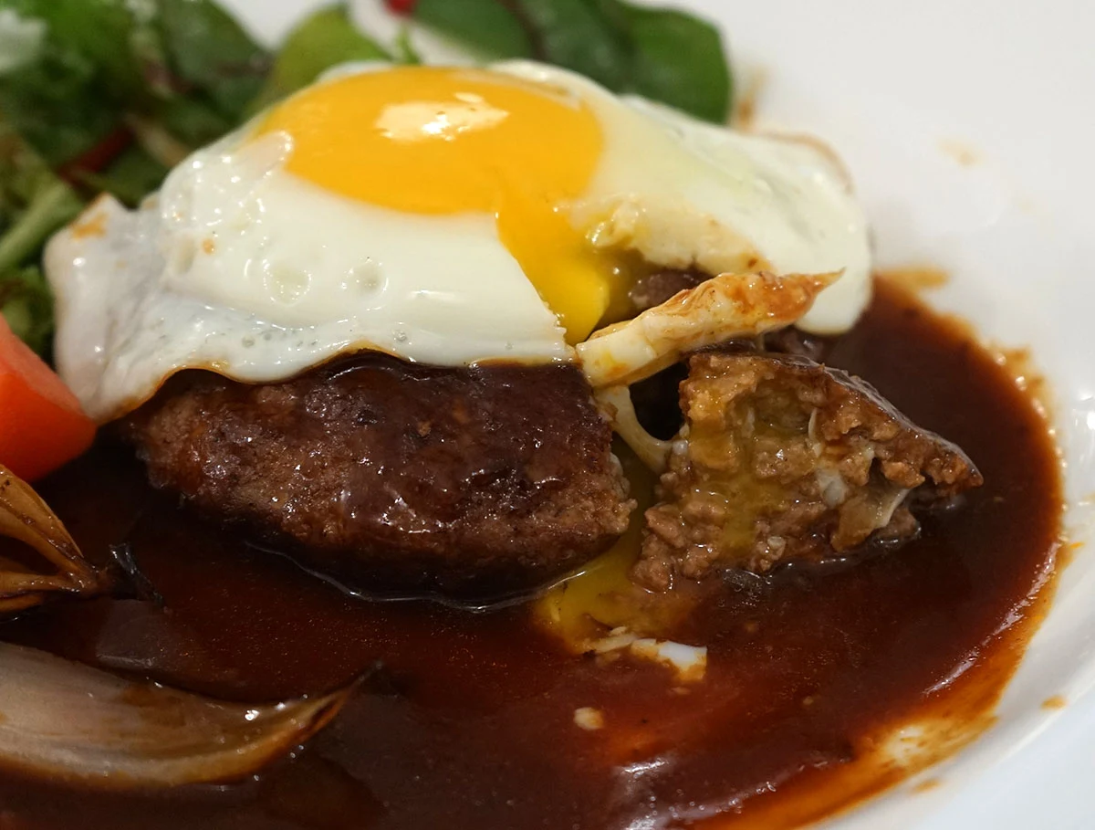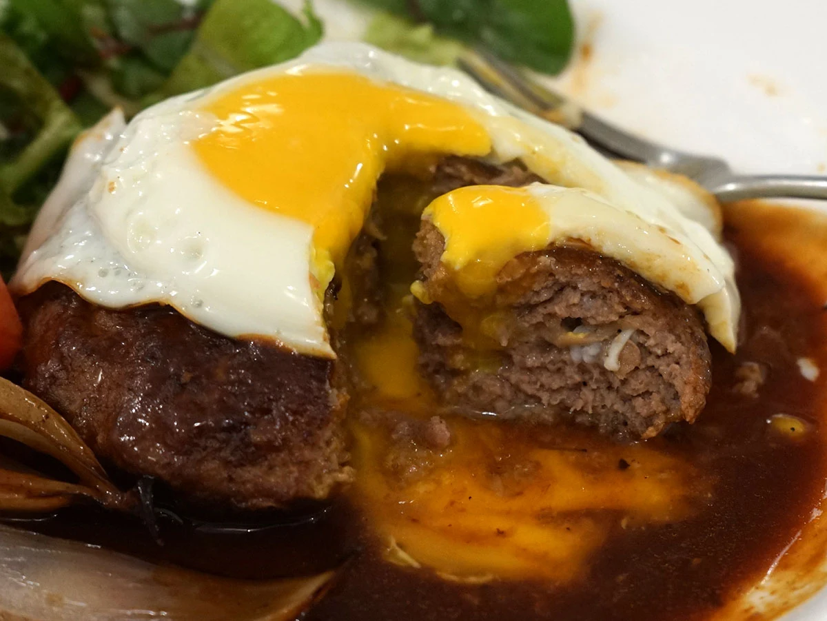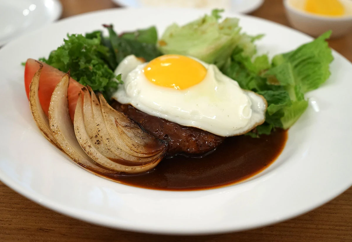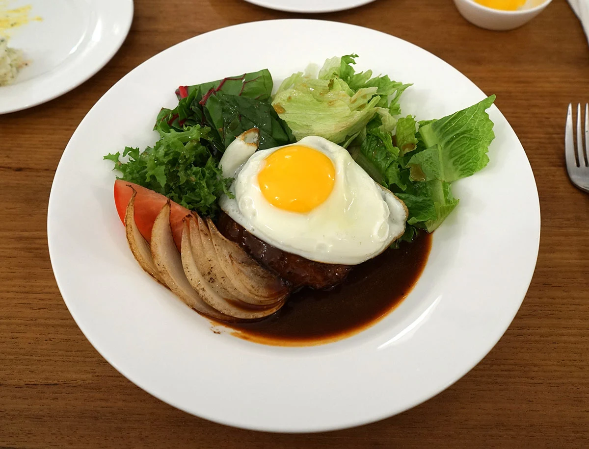 뭔가 전체적으로 참 예쁘다. 함박스테이크가 수줍게 계란 후라이 아래에 몸을 숨기고 있다.