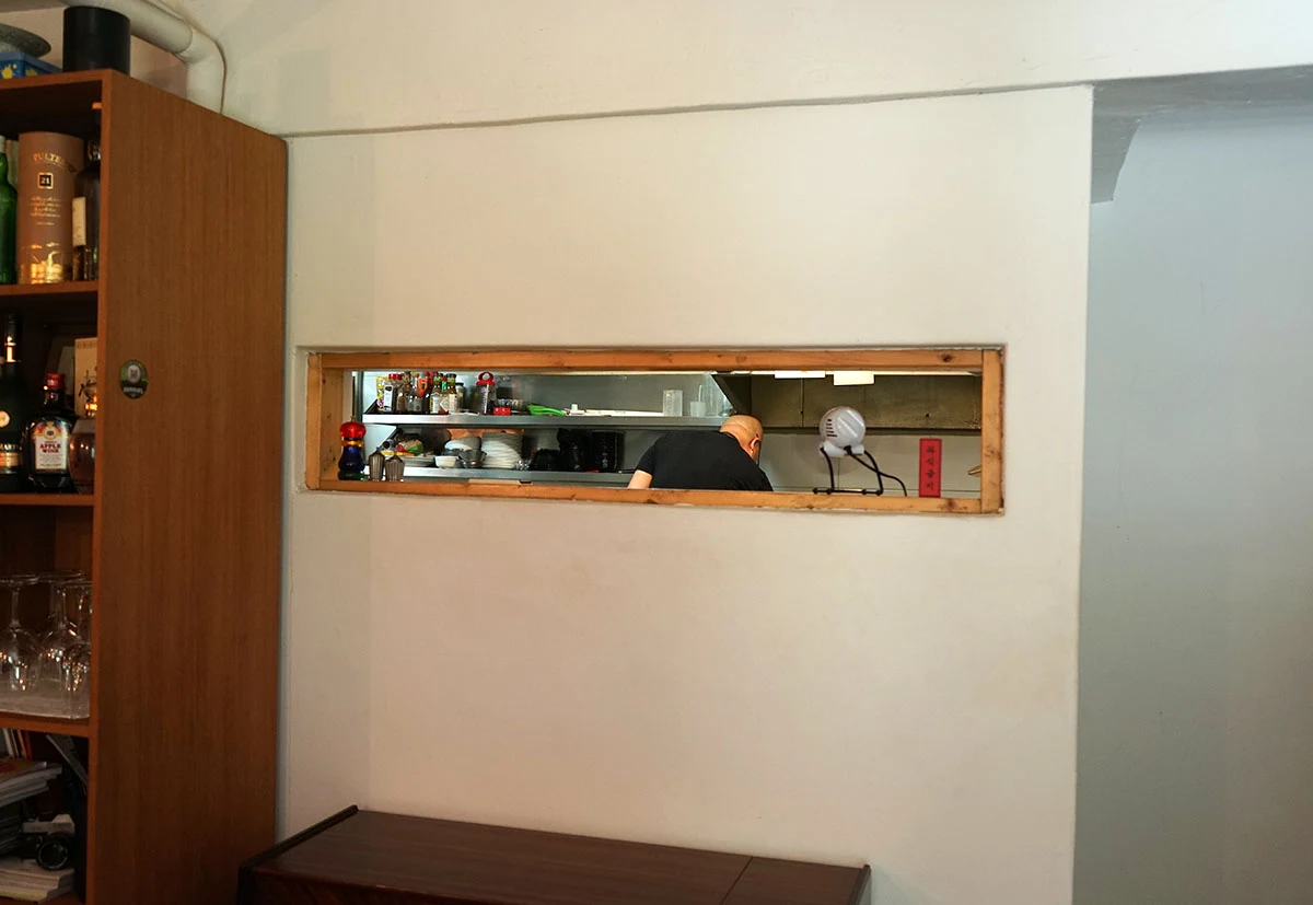 주방이 살짝 보이는데 오른쪽에 세로로 과식금지라 적힌 푯말(?)도 있다.