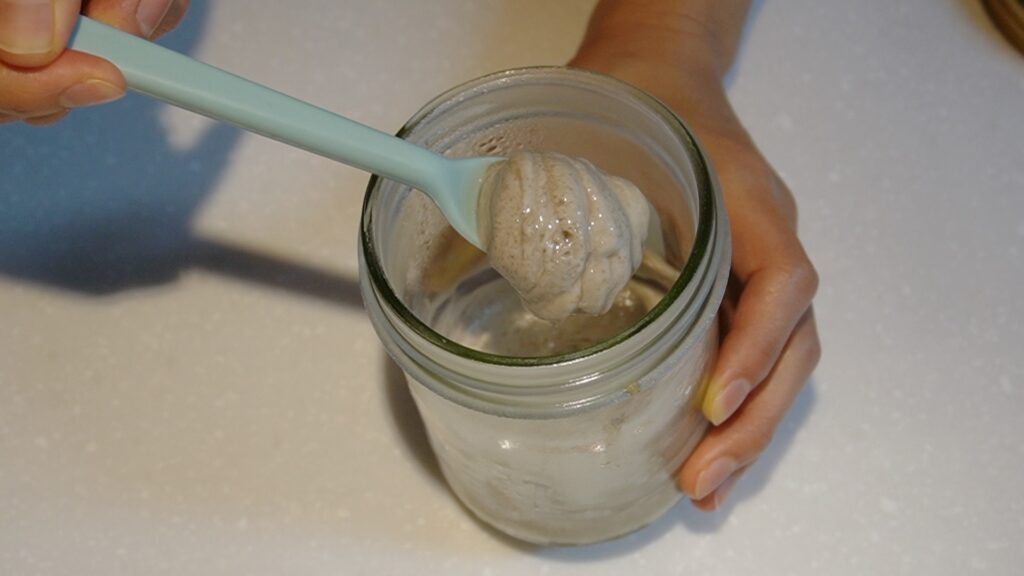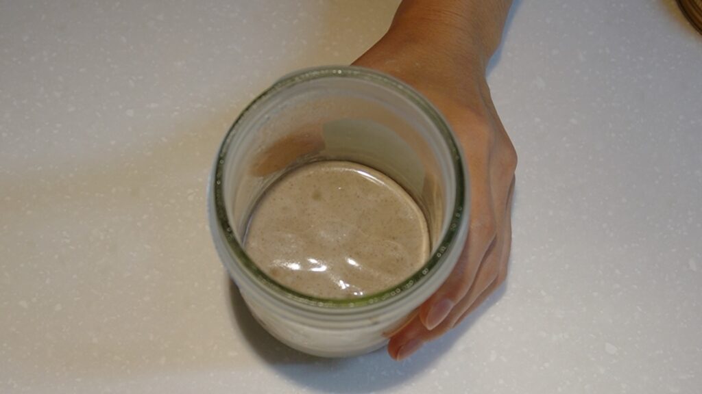 A. 밀가루 대비 물의 비율이 약 80%정도로 약간 뻑뻑한편인데, 수분율 100%의 먹이비율보다 수분이 조금 적은 환경이 효모균 자체의 건강함이나 발효력면에서 더 안정적인 결과를 가져왔다.