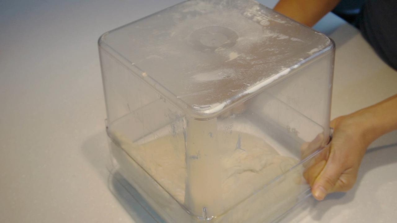 발효를 마친 반죽을 작업대로 옮긴다. 이때 반죽을 손으로 잡아 빼면 가스가 다 빠져나가고 반죽이 뭉치므로,