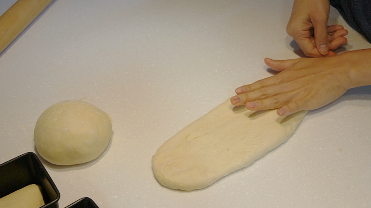 1. 중간발효가 되어 유연해진 반죽덩어리의 매끈한면이 위로 오게 한다음 밀대로 밀거나 손으로 쳐서 길게 만들어 준다. 이때 주의할 점 두가지가 있다.