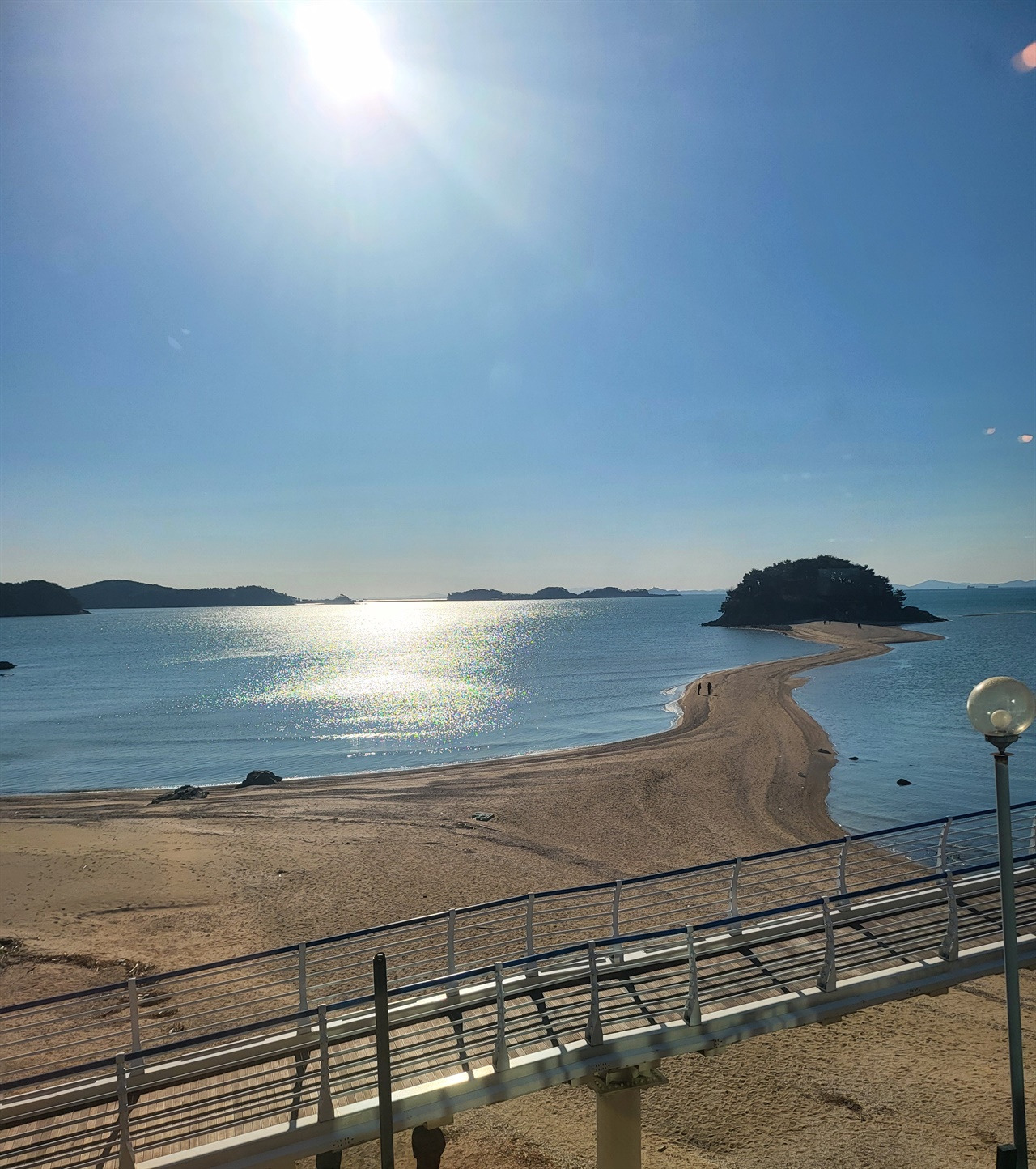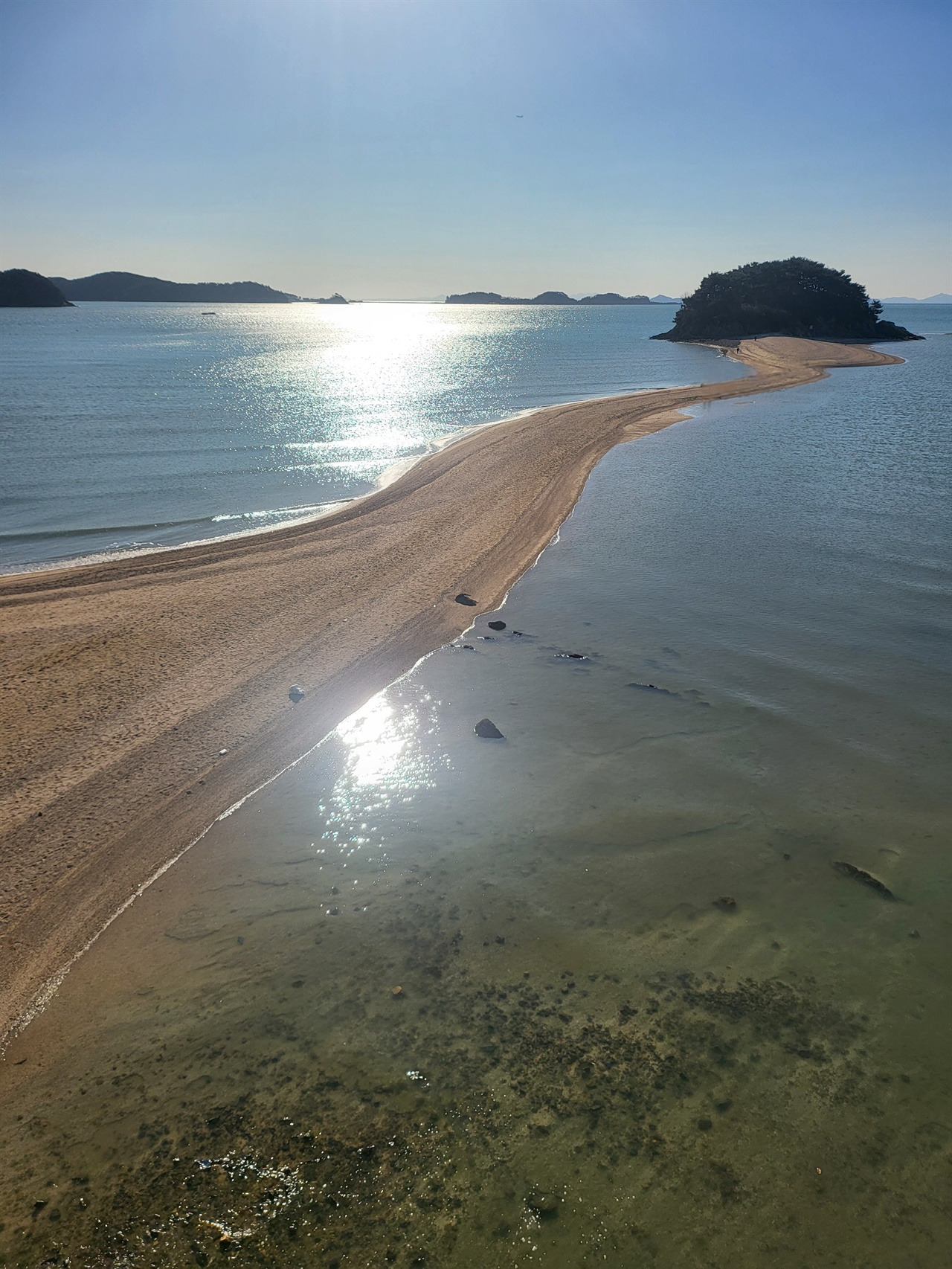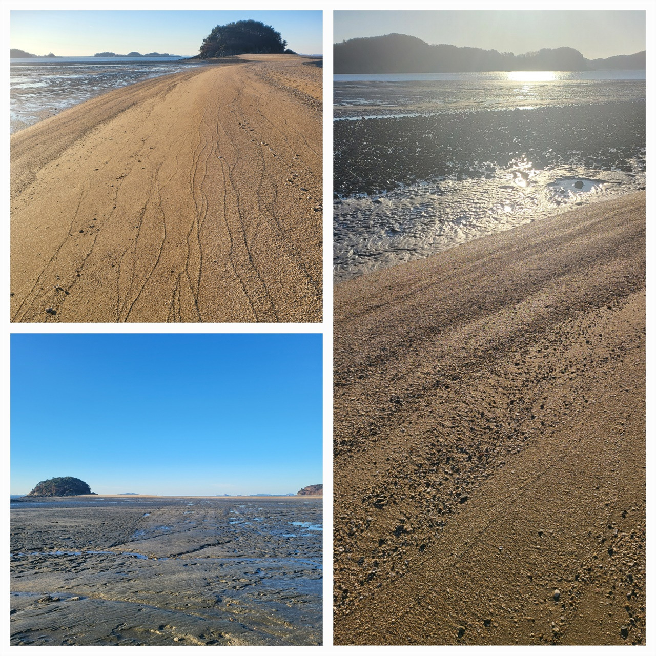 우리가 감개무량한 듯이 예쁜 섬마을을 보며 들뜬 것은 서막에 불과했다. 그 언덕을 넘으니 넓은 바다가 눈앞에 펼쳐졌다. 물이 쫙 빠진 바다는 온통 뻘밭이었다. 하지만 목섬으로 향하는 길만 오롯이 황금빛을 드러내고 있었다. 게다가 아침 해를 받은 윤슬은 그야말로 반짝이는 물비늘이었다.