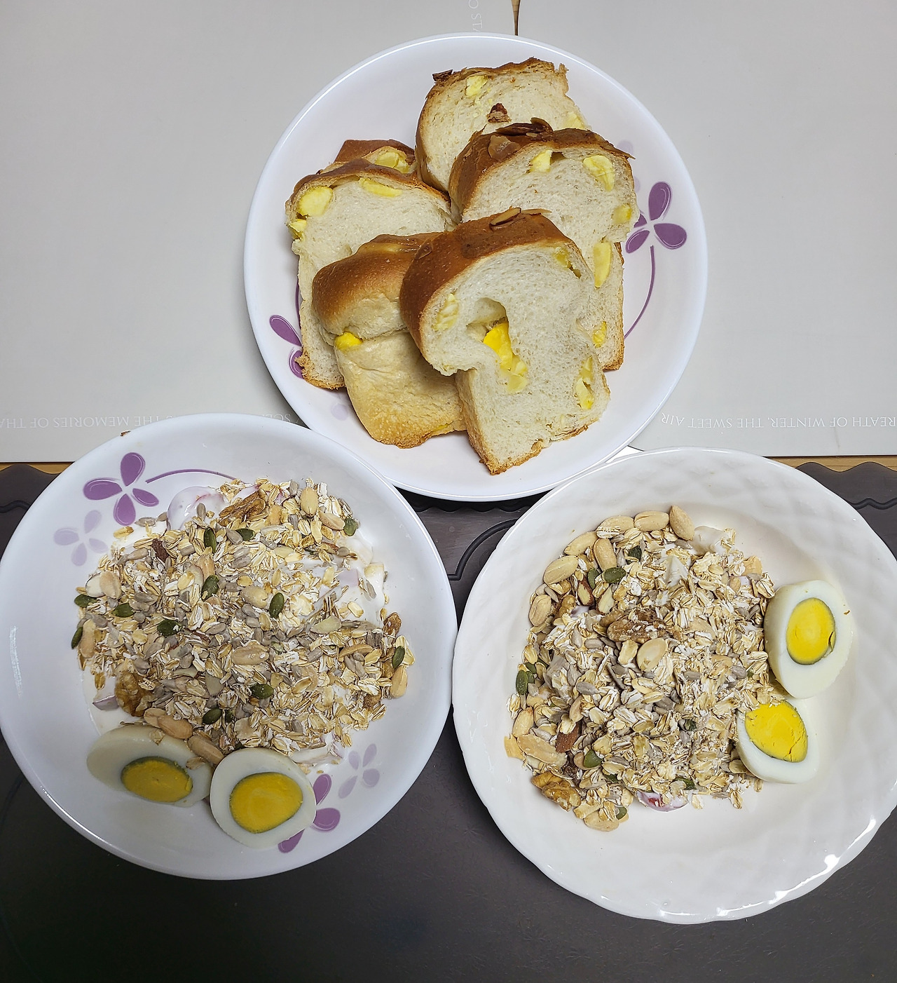 올케는 요거트에 버물린 시리얼과 함께 구운 바케트 한 조각과 커피를 곁들인다.