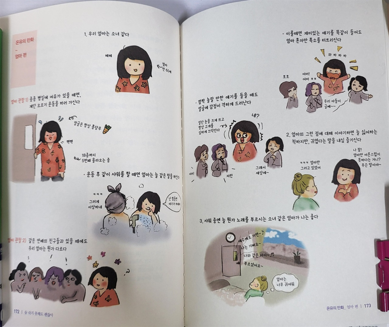 책 중간중간에 온유 씨가 그린 익살스러운 만화가 브레이크 타임을 제공해 주었다. 그중에 '엄마 편'이 인상적이고 감동적이었다. 온유 씨 눈에 비친 엄마는 언제나 명랑하고 잘 웃었다. 이런 딸을 간호하며 사는 삶 속에서 웃음을 잃지 않은 엄마가 위대해 보였다. 엄마의 긍정적인 에너지가 온유 씨에게 좋은 영향을 미쳤을 것 같다. 삶에 대한 의욕을 붙들게 했을 것이다.