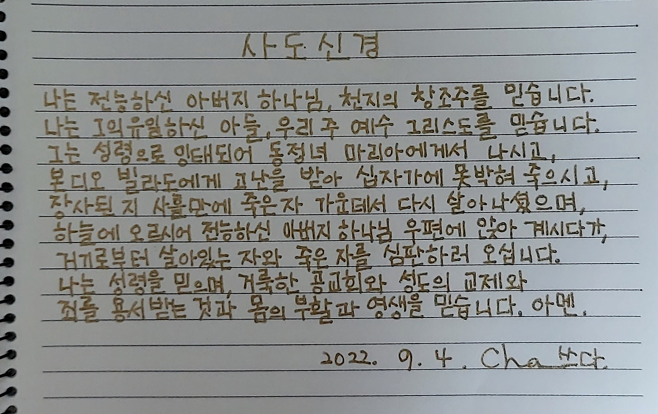 그래서 꾹꾹 눌러서 사도신경을 적어보았다. 캘리그래피 서체로. 이 사도신경이 다 믿어진다면 하나님께 인정을 받을 클래스가 될 듯하다.