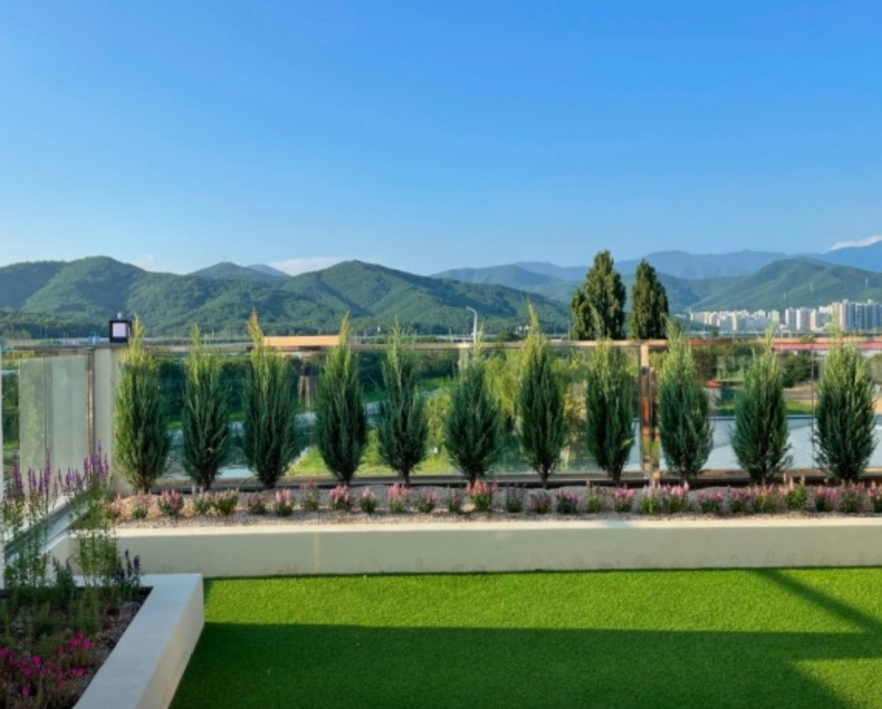 루프탑 카페에서 짙은 녹색의 산과 파란 하늘을 보니 녹수라는 단어가 구독자님과 제대로 어울렸다.