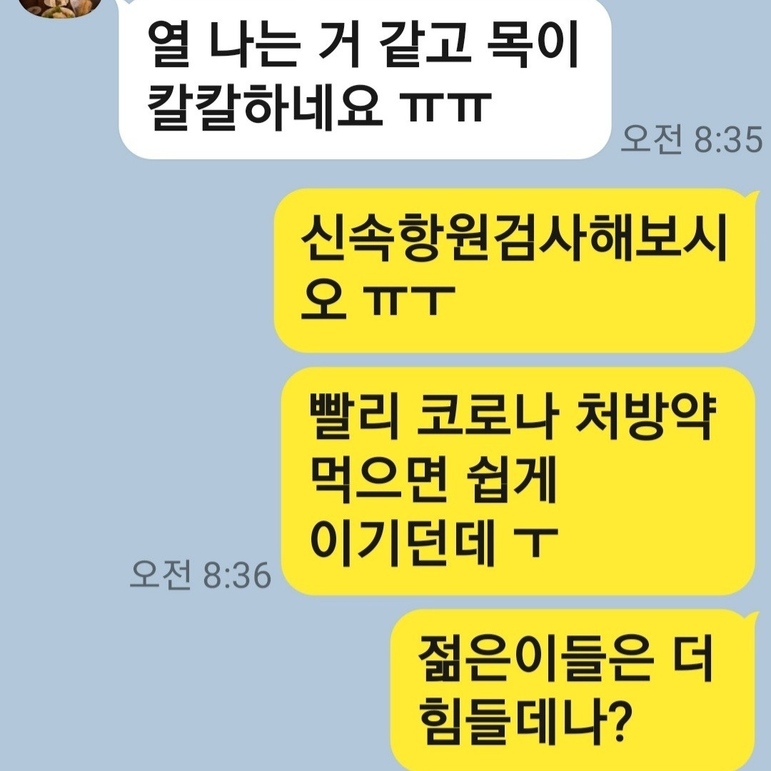 "그러면 드시던 약은 끊으시고, 현재 병세에 맞게 처방을 다시 했으니 이 약을 드십시오. 그리고 '코로나 치료제'는 지정된 병원에서만 탈 수 있으니 도보나 자차를 이용하여 그곳에 가서 약을 타십시오."