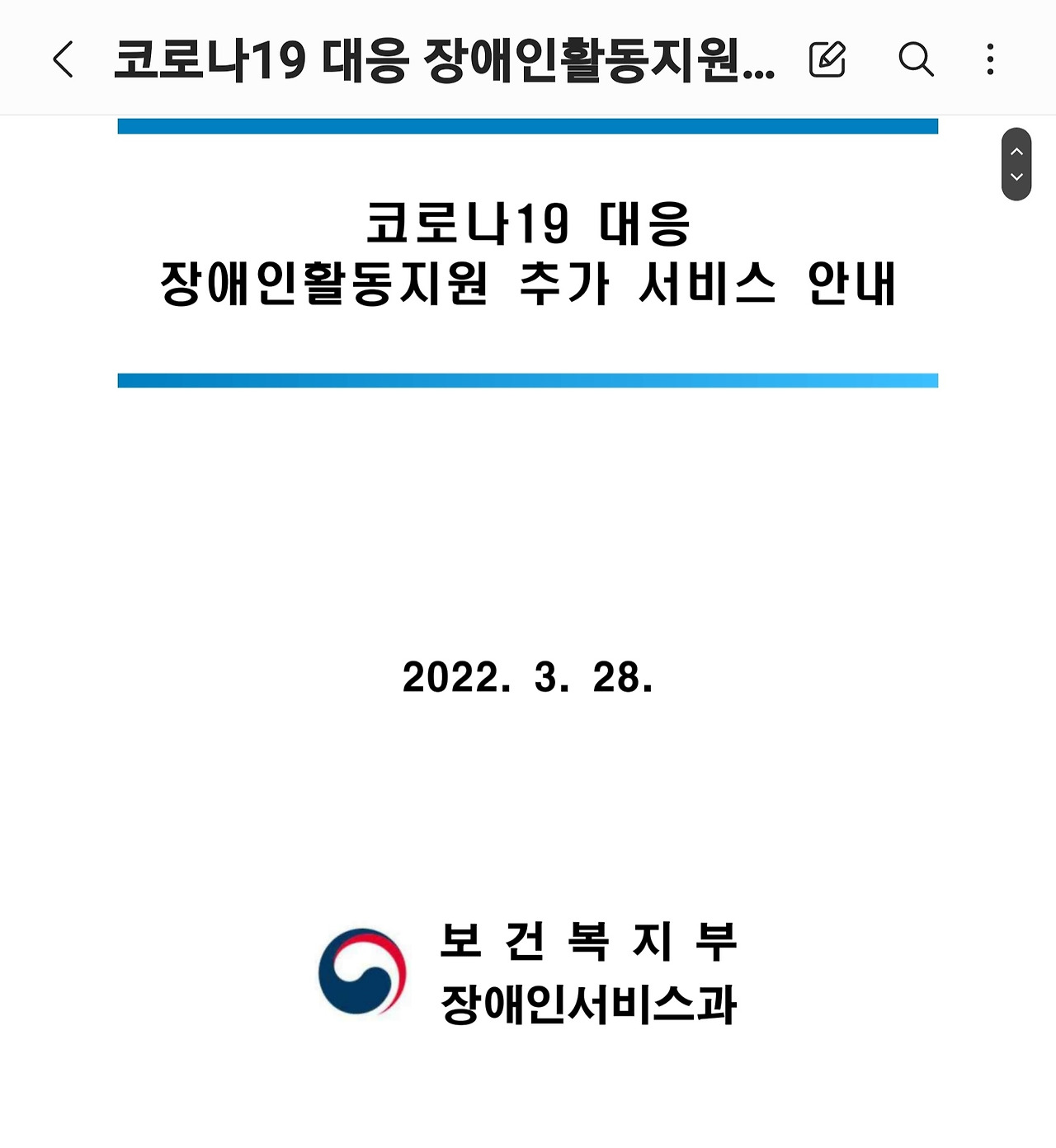 [보건복지부 / 장애인 서비스과/ 코로나 19 대응 장애인 활동 지원 추가 안내 매뉴얼 공문 표지]