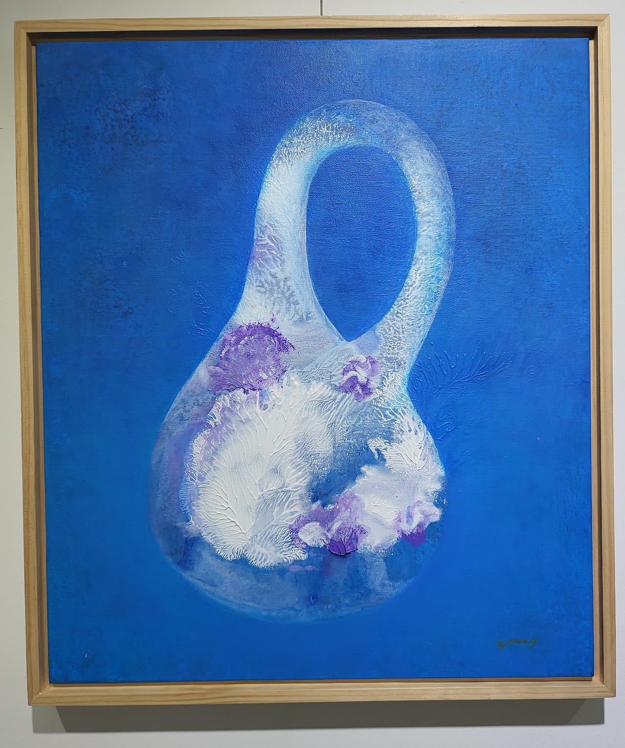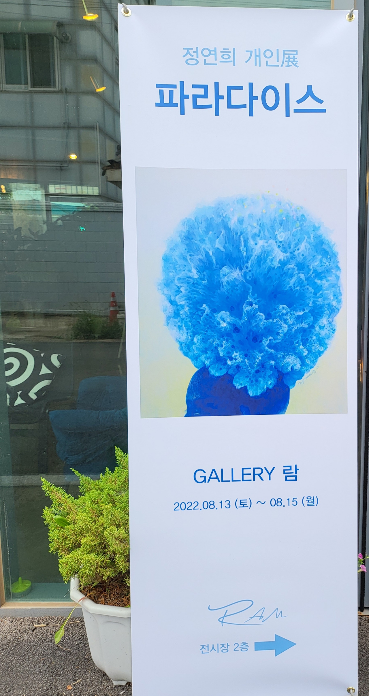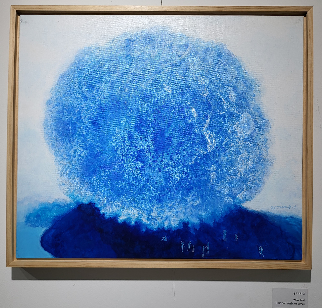 정갈하고 소담스러운 캔버스에서 오는 메시지가 참 따뜻했다. 아크릴이라는 물감을 사용했고 서양화에다 동양화 기법이 가미된 작품이라는 화가의 설명을 들을 수 있었다. 파란 나라를 보았다. 희망의 나라!