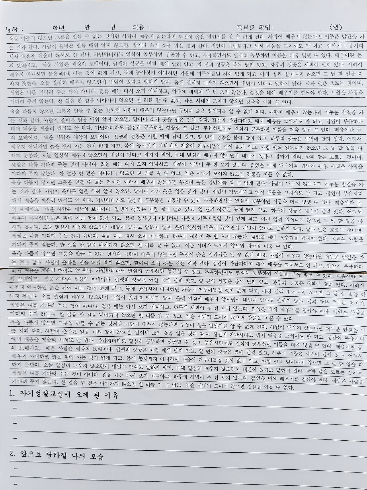 "혹시 오늘까지 교과서 정리한 것을 검사받으러 오지 않으면, 명보('명심보감' 줄인 말) 펜맨십 쓰기 '반(1/2)' 장이 벌칙이에요. 부모님 확인도 받아와야 하고요. 그것을 깜빡하고 안 해오면, '교사 지시 미이행'으로 '자성 교실' 명단에 올립니다."