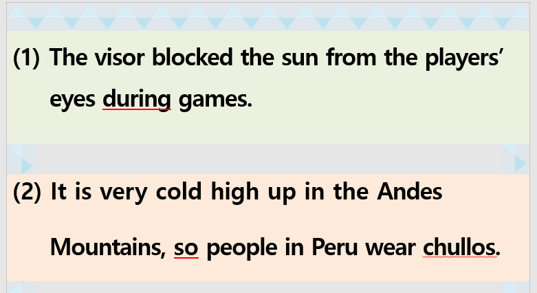 "자, 여기 이 문장(1)과 (2)에 있는 'during'과 'so'의 품사가 무엇인지 알아보겠어요."
