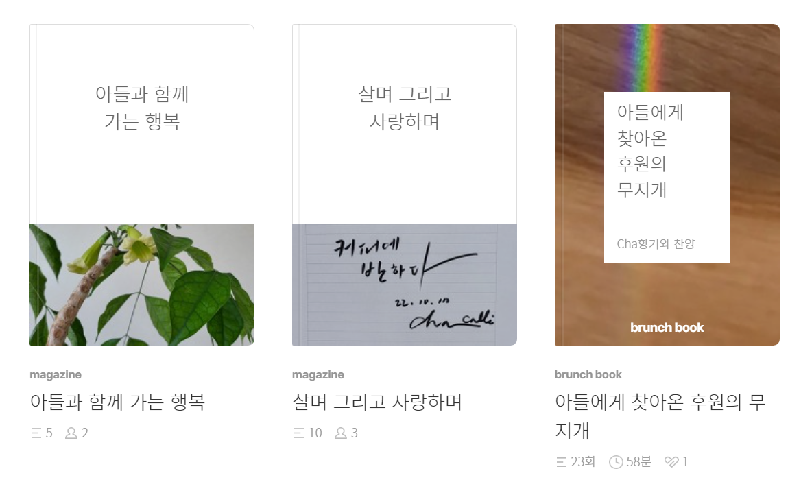 총 조회수 5만 회 이상에 134편의 글이 발행되었다. 다른 작가들의 분량에 비하면 많은 것인지 평균 이하인지 알 수는 없다. 다만 브런치에 등단하지 않았더라면 내 머릿속을 맴돌고 있었을 생각들을 갈래 잡아 잘 정돈하고 나니 생각의 집을 대청소한 기분이라 맘이 개운하다. 브런치북 8권 완결, 매거진 2권은 진행 중이다. 가장 조회수가 높았던 글은 '시월드 플렉스', '아무도 기억해주지 않은 아들의 생일', '반려 가전제품, LG전자레인지'등이다.