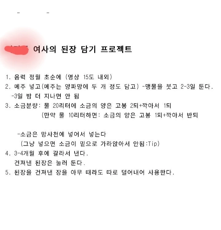 [어머니가 말씀하시니 된장 레시피를 받아 적어서 정리한 것/ 어머니의 레시피대로 내가 직접 담근 된장]