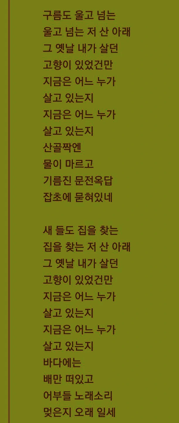라고 하셨다. 그 당시에 우리가 배운 노래는 주로 ‘학교종’, ‘산토끼’, ‘나비야’ 이런 것이었다. 배인호는 머리를 긁적이며 학생들 앞에 섰다. 그가 부른 노래는 내게 잔잔한 충격이었다. TV도 없던 시절이었다. 단 한 번도 들어본 적이 없었던 노래였다. 구름이 운다고 했다. 구름이 울면서 고개를 넘는다고 했으며 어느 누가 살고 있는지? 궁금해하며 고향을 그리는 구슬픈 내용의 노래였다. 어린 감성에 노크하는 노래였다.