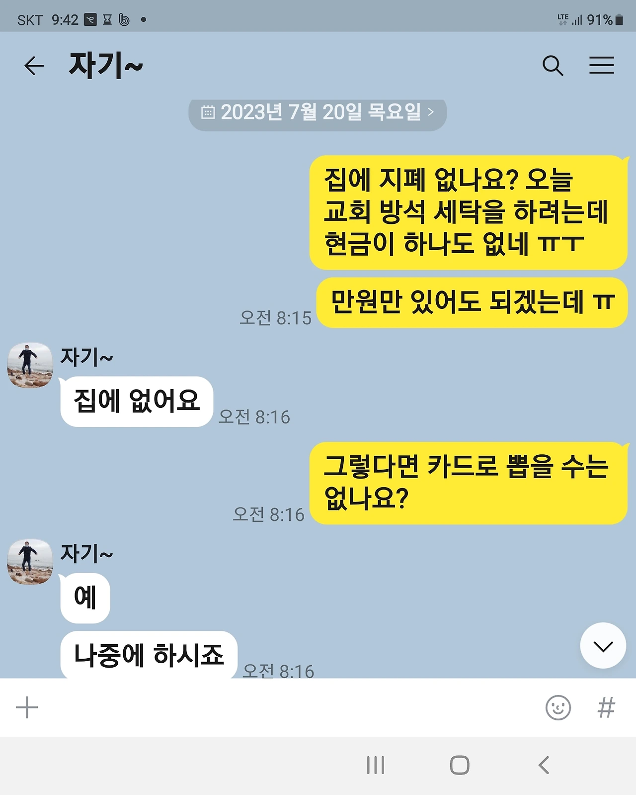 방학이라 나는 평상시 보다 늦게 일어났고 남편은 먼저 집을 나갔다. 그래서 현금을 챙겨 받지 못했다. 남편에게 카톡을 보냈다.