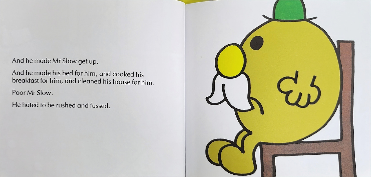 Mr. Busy와 Mr. Slow가 소풍 가는 장면에서도 그들의 성향이 극명하게 드러난다.