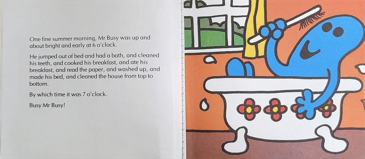 (어느 화창한 여름날 아침, Mr. Busy는 6시쯤에 일어나서 밝고 이른 시간에 일어났습니다. 그는 침대에서 일어나 목욕을 하고, 이를 닦고, 아침을 요리하고, 아침을 먹고, 신문을 읽고, 설거지를 하고, 침대를 정리하고, 위에서 아래까지 집 청소를 했습니다. 어느덧 7시가 되었습니다. 바쁘다 MR. BUSY!)