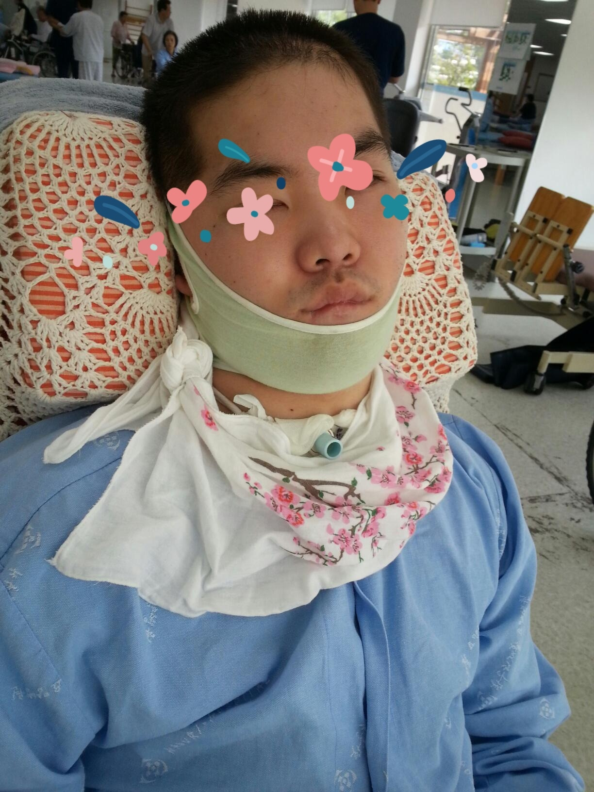 입을 벌려 마우스 피스를 끼우고 뱃줄을 삽입한다. 그럴 때 아들이 입을 앙다물고 있어서 의료진이 입을 벌리려고 하는 과정에서 턱이 빠졌다.