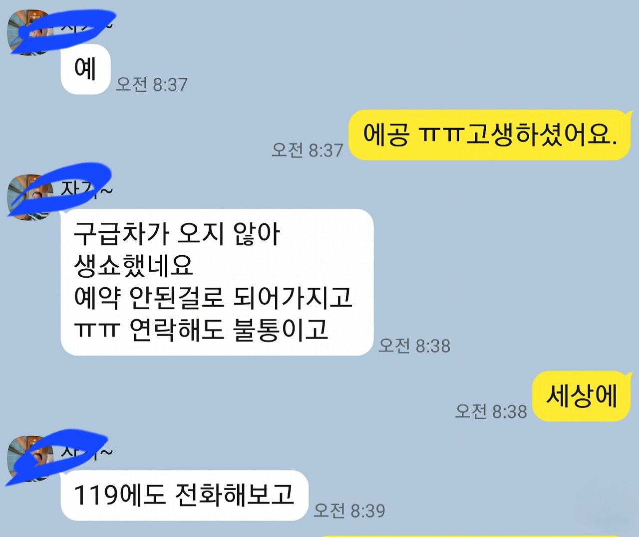 어찌어찌 수습하여 아들을 실은 구급차는 병원에 도착했단다. 이런 불상사를 겪고 보니 하루 전날 예약 상황을 미리 체크해 보지 않은 것이 후회됐다. 예약 확인 문자까지 받아둔 상태라 이런 일이 벌어질 줄을 예상치 못했다.