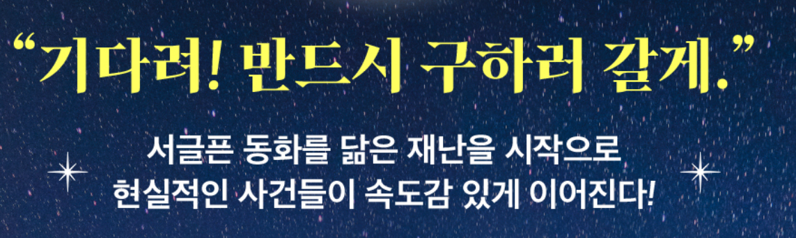 책의 표지에, "서글픈 동화를 닮은 재난을 시작으로 현실적인 사건들이 속도감 있게 이어간다"라고 적혀 있다.