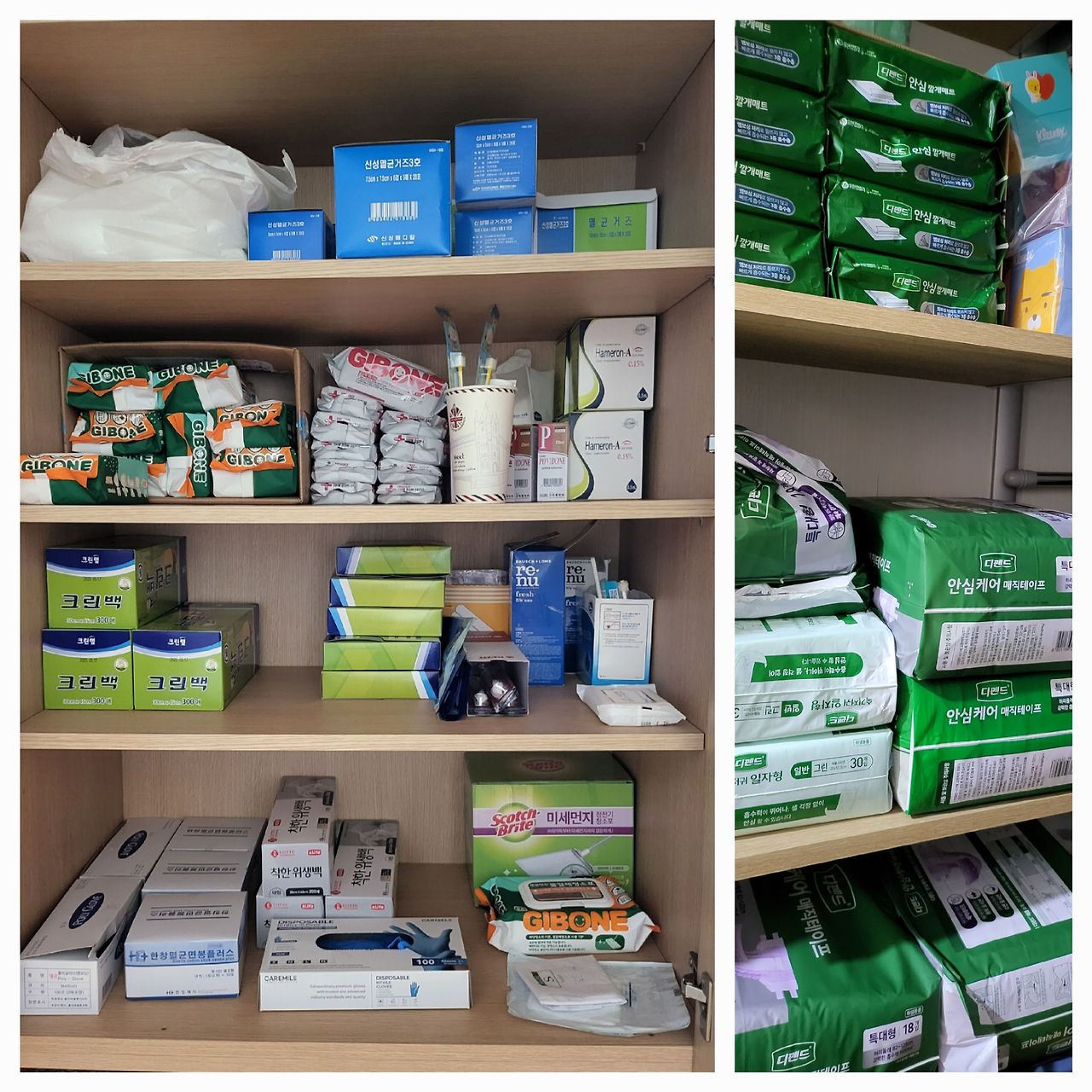 [수납장에는 간병 물품들이 마트처럼 쌓여있다.]
