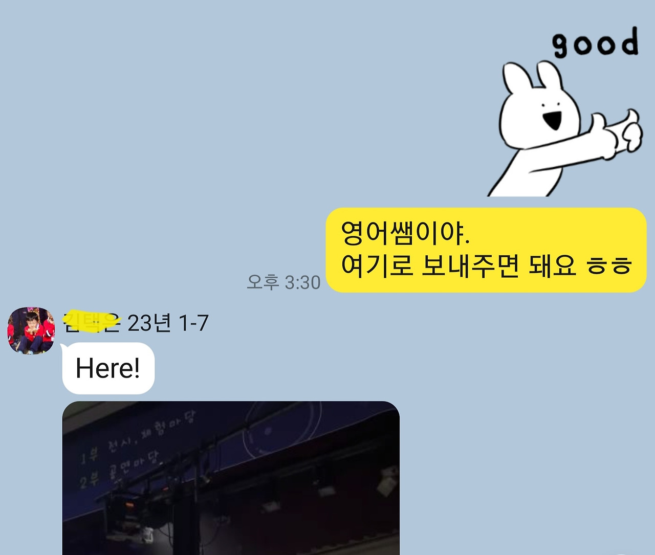 축제에 Tak이 춤췄던 그 영상을 구하려고 Tak에게 부탁했더니 Tak이 카톡으로 보내왔다. Here! (여기요~)하면서...