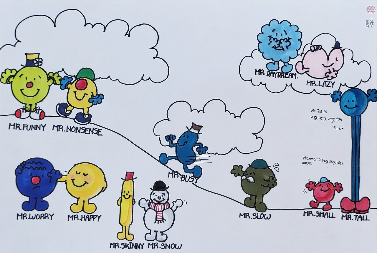 '아하, Ji가 이런 데 소질이 있었구나!'라고 생각했다. Ji의 숨겨둔 발톱을 교실 밖에서 발견한 셈이다. 그래서 더욱 Ji에 대해 관심이 커져 갔다. 그런데 이번에 내가 개설한 '주제 선택', 'Mr. Men 읽기' 강좌를 Ji가 수강하고 있었다.