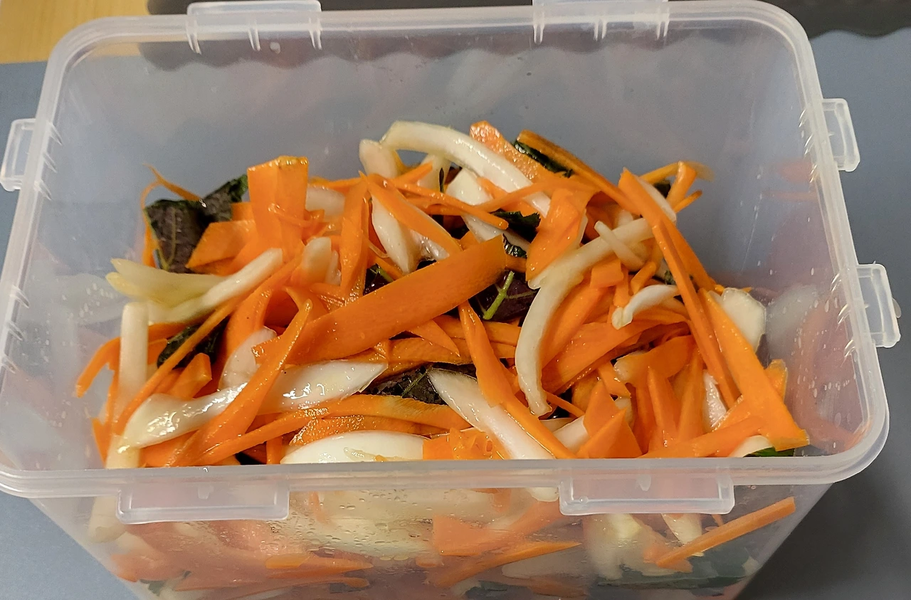 긴 나무젓가락으로 절인 당근을 무치면 금상첨화. (창의성 뿜뿜)
