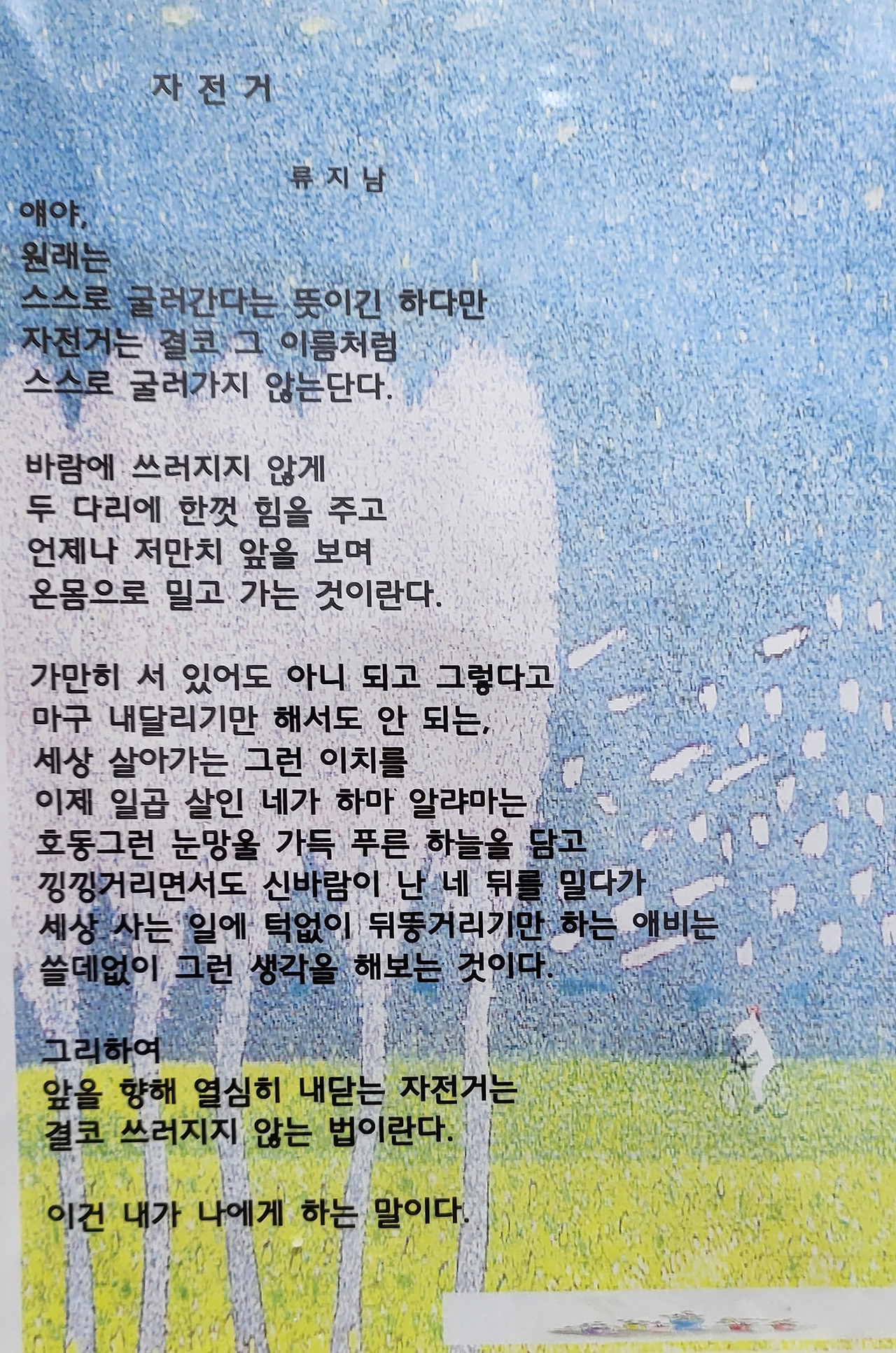 그러나 이 시를 읽을 때면 시의 내용은 차치하고 아들에게 이 시를 읽어 주고 싶은 맘이었다. 아들의 상태가 어제보다 오늘은 좀 더 좋아지고, 점점 더 나아져서 우리와 소통이 된다면 아주 나지막이 이 시를 그에게 읽어주고 싶었다. 아마 아들은 '자전거'라는 소리만 들어도 경악할지 모른다.
