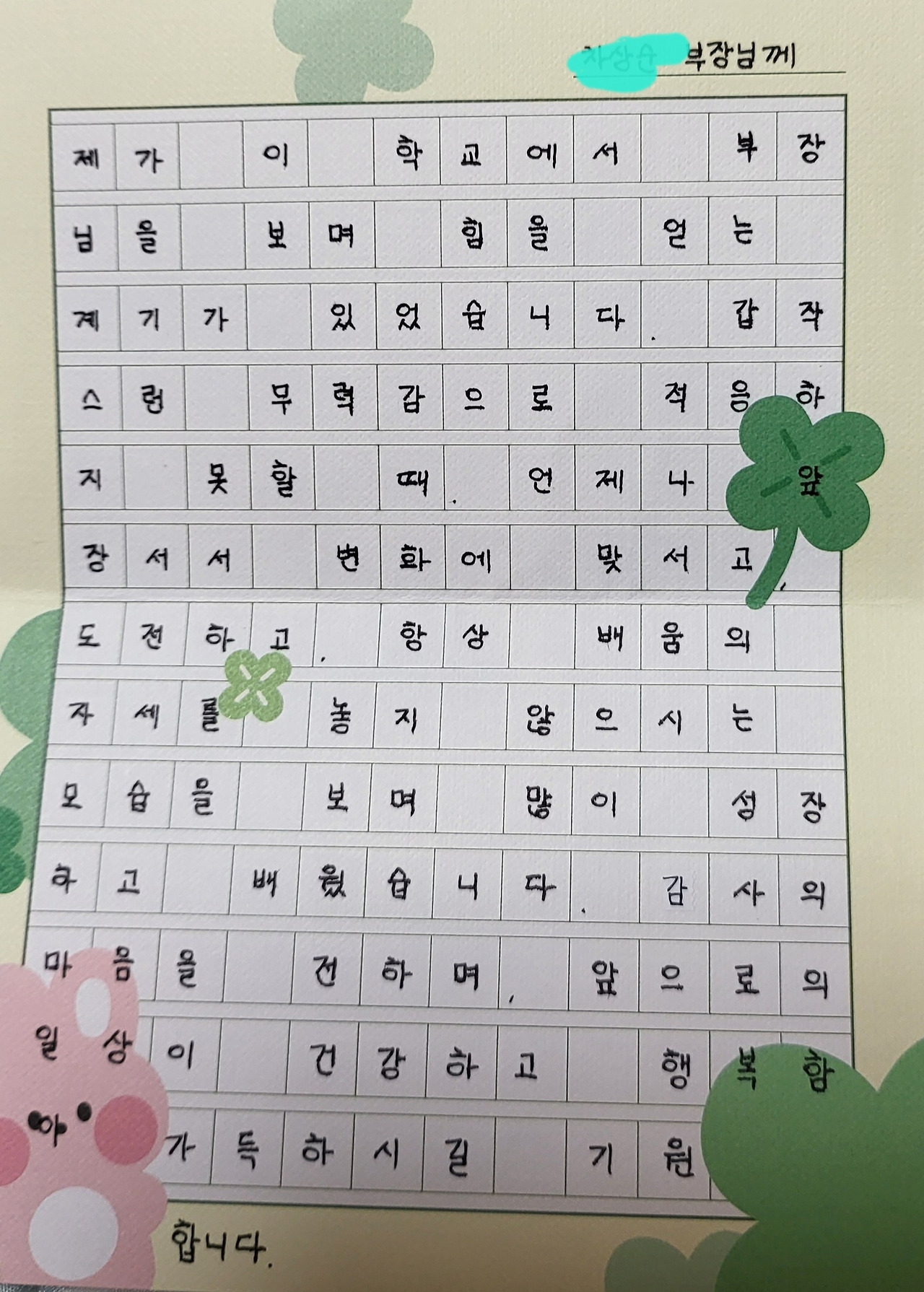나 때문에 힘을 얻는 계기가 있었다고 적혀 있었다. 내가 뭘 했을까? 그렇다면 내가 좀 괜찮은 사람이었을까? 아니야, 내가 복이 많아 이렇게 좋은 분을 만난 것이겠지... 만감이 교차했다. 이 정성스러운 편지를 읽는 동안에 나의 자존감이 나도 모르게 올라갔다.