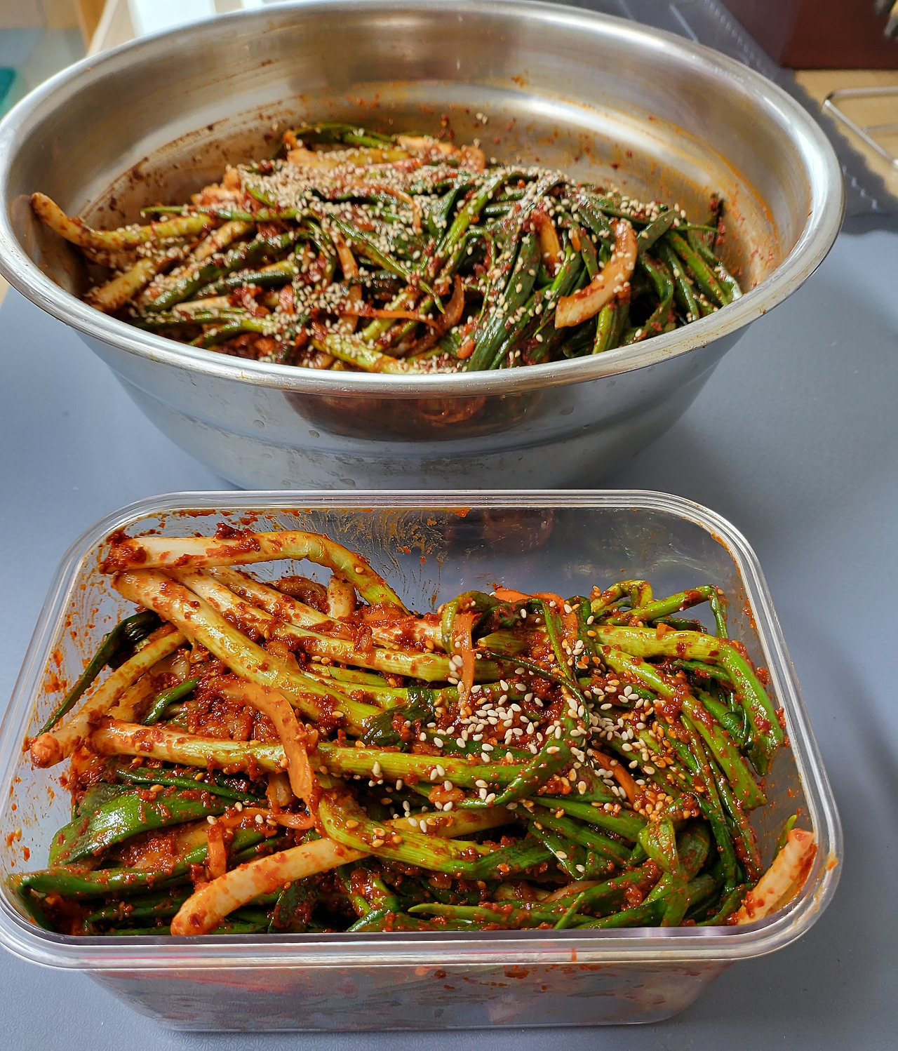파김치를 버무린 후에 한 5분 정도 있다가 찬통에 옮겨 담으면 쪽파가 숨이 죽어 나긋나긋해진다. 찬통에 덜어 담기가 훨씬 수월해진다.