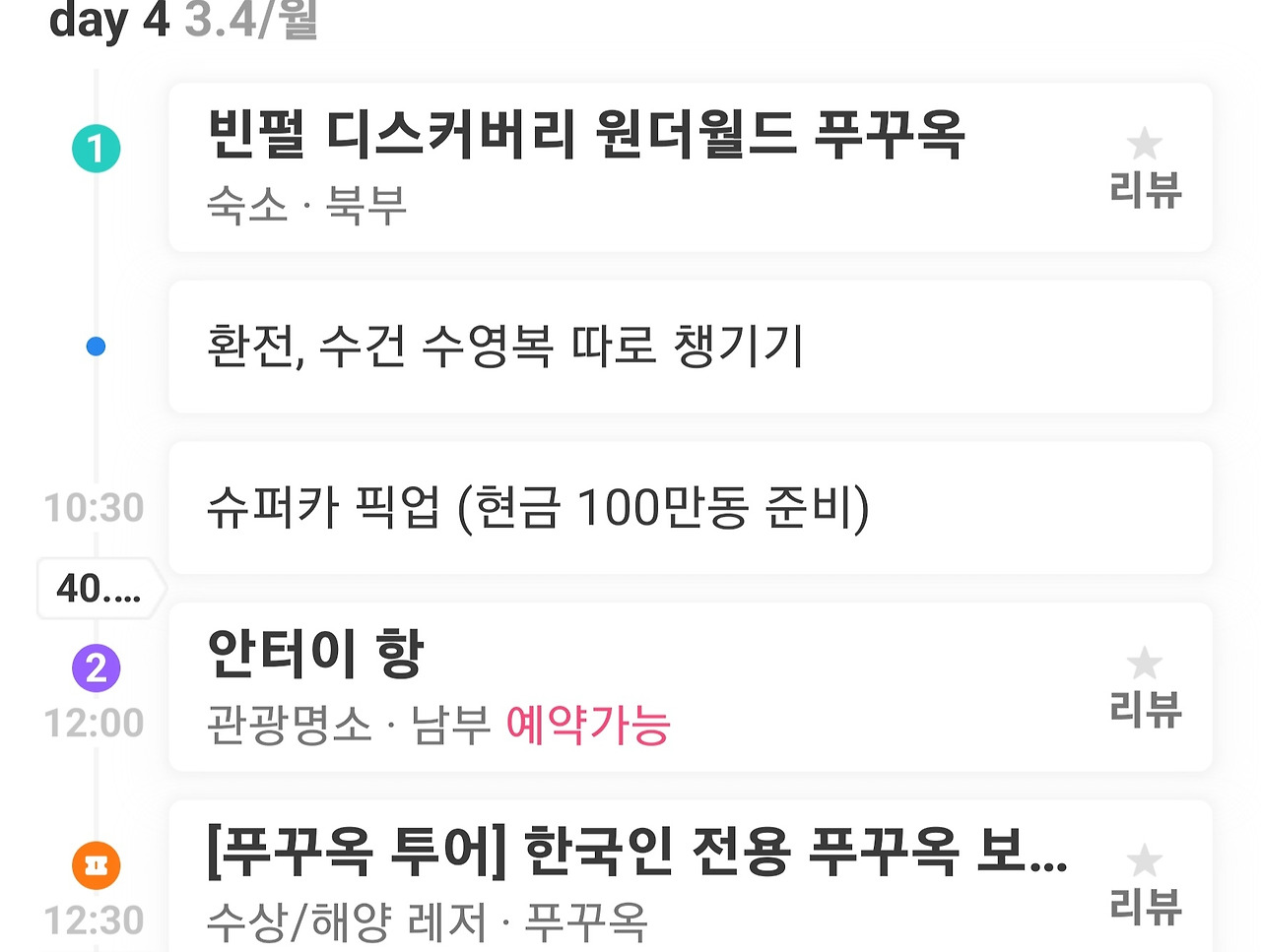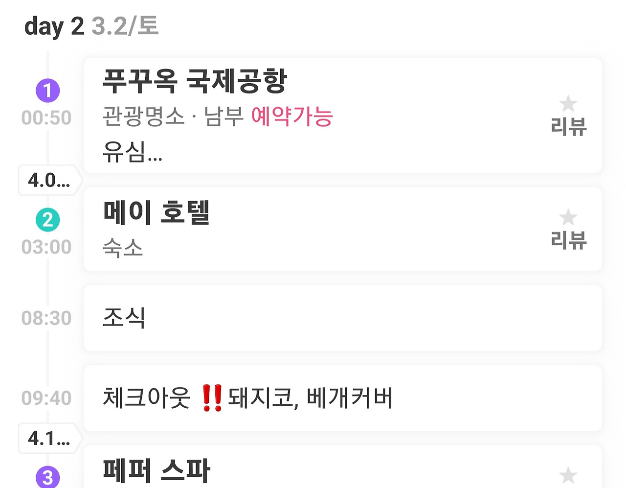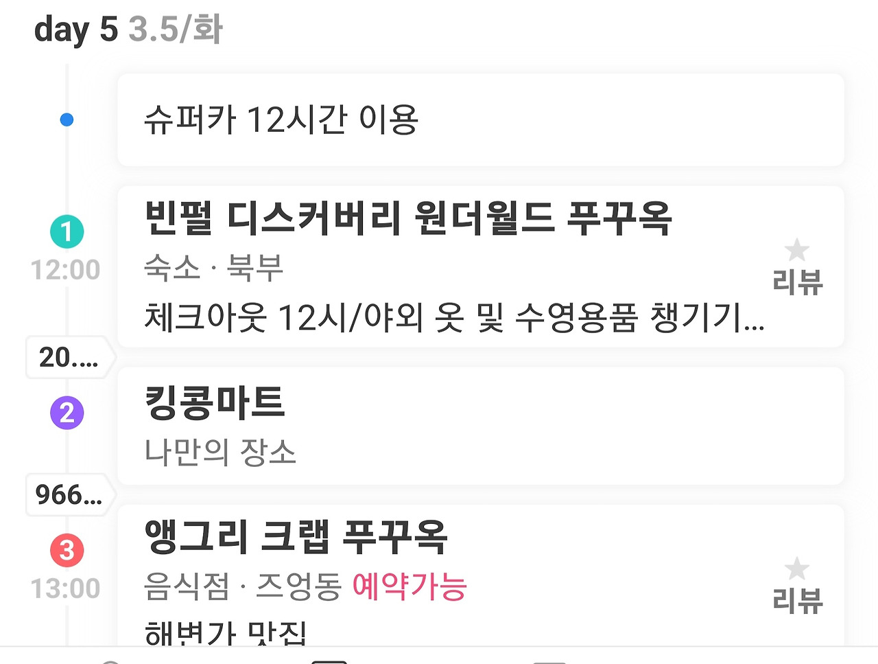 타임라인을 펼쳐놓으니 푸꾸옥에서, 첫날엔 페퍼 스파에 갔구나, 둘째 날에는 빈펄 사파리를 들렀구나, 그다음 날은 안터이항으로 스노클링을 하러 갔군, 마지막 날에는 킹콩마트에 가서 선물을 잔뜩 샀군, 등등 여행 일정을 새록새록 다 기억할 수 있었다.