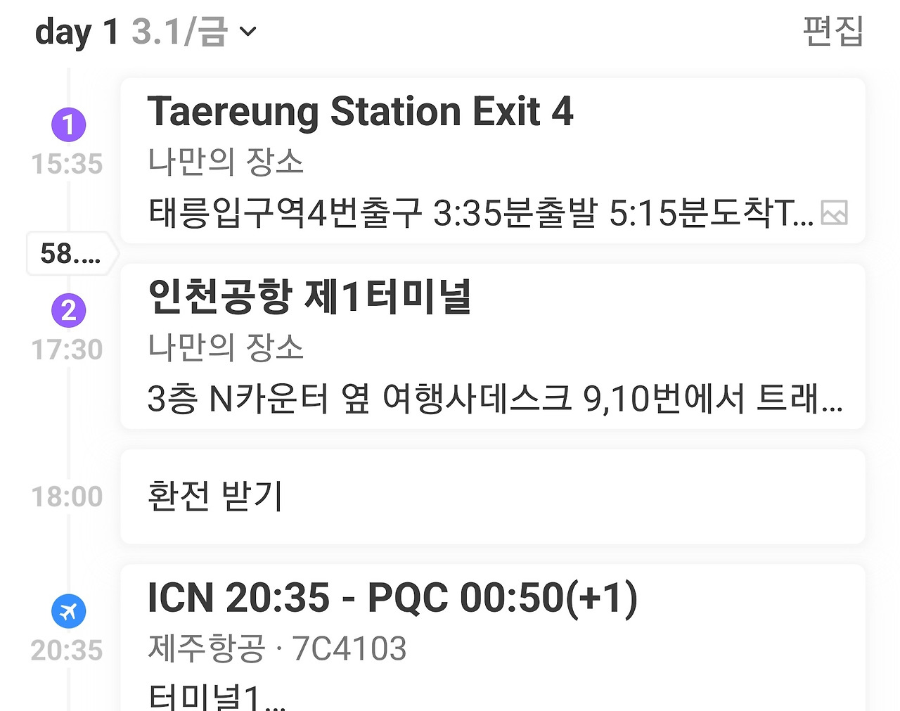 숙소의 주요 정보 및 우리들이 그 장소에서 챙겨야 할 것에 대한 메모도 기입할 수 있다. 이 앱에 일정을 깨알같이 짠 딸내미에게 박수를 보낸다. 여기저기 알아보고 결정한 루트였으니 따라가는 우리는 거저 먹는 격이었다. 그래서 이 일정을 다른 분들에게 팔고 싶을 정도였다. 한 번 사용하고 버리기에는 아까웠다.