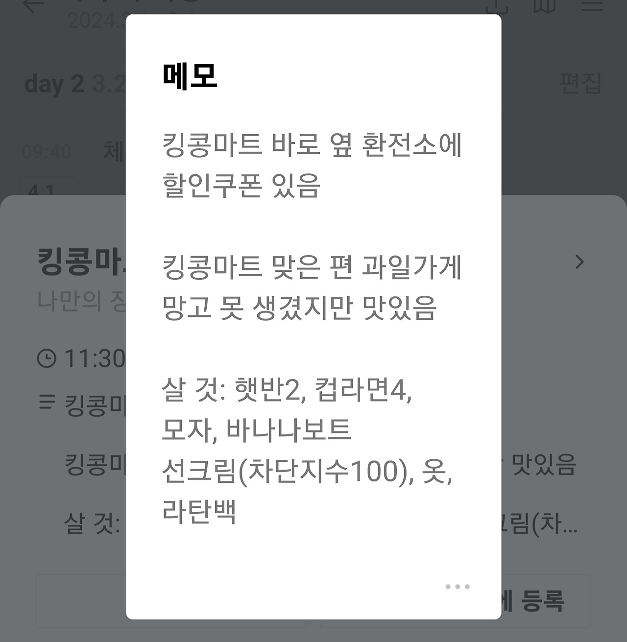 이 앱 덕택으로 여행 일정을 미리 알 수 있었고 준비물도 체크할 수 있었다. 메모를 클릭하면 아래 사진처럼 팝업으로 뜬다.