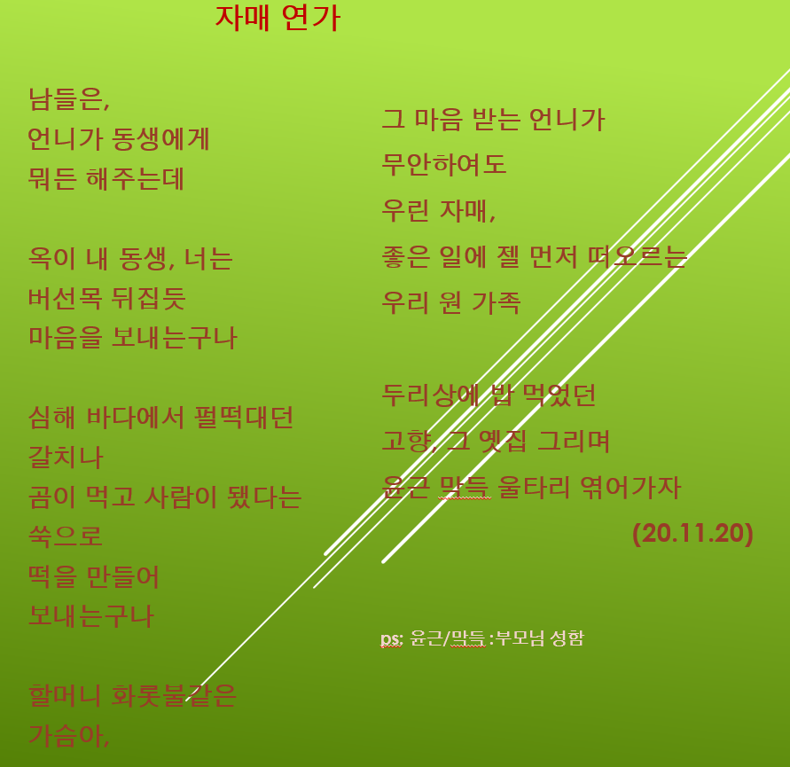 어릴 때 우리 형제들에게 도움이 되고 싶다고 했던 소원이 이루어지고 있다. 한낱 보잘것없는 씨앗 같았던 동생의 꿈이 바야흐로 현실의 꽃으로 피어나고 있다.