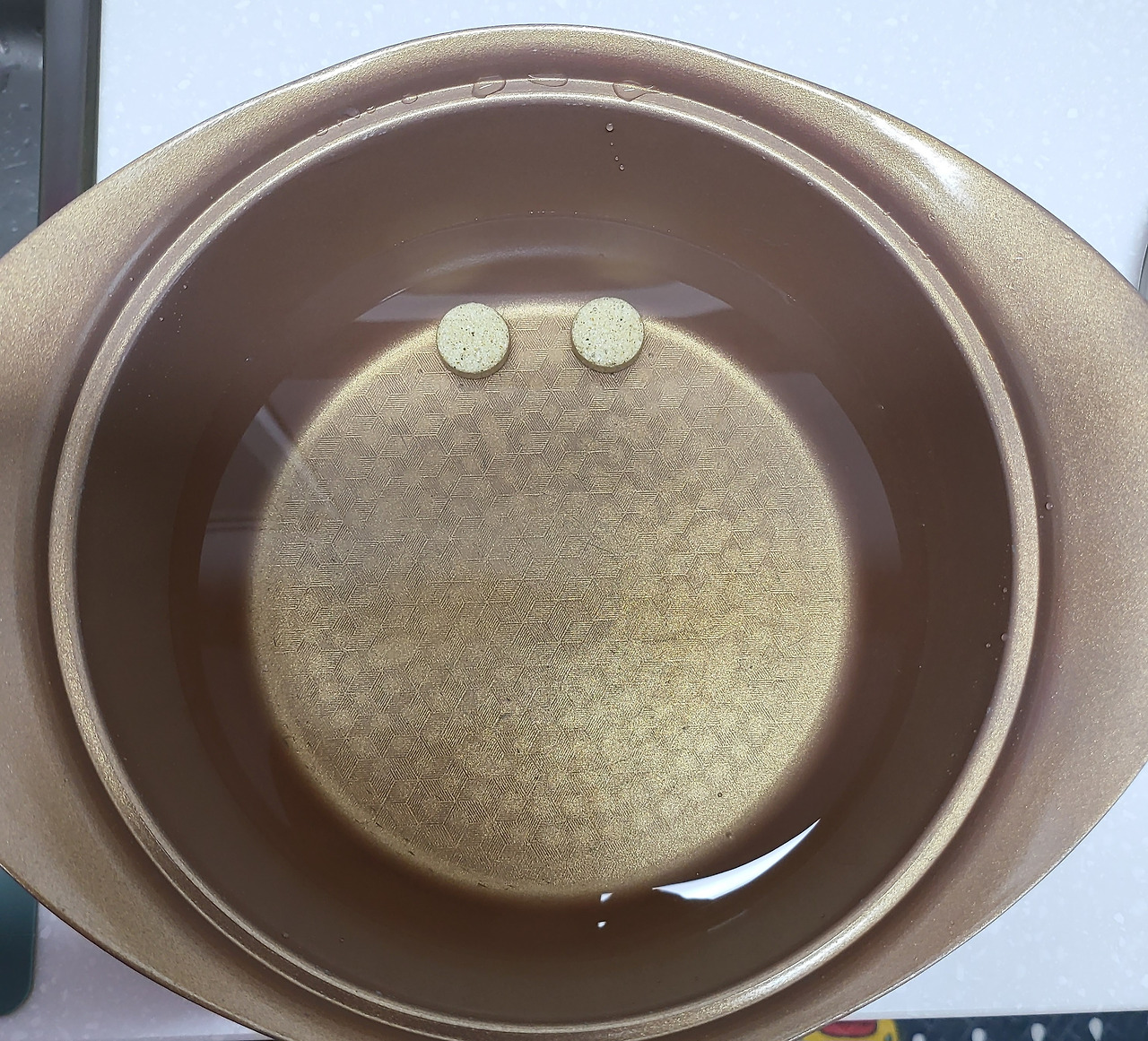 ['황금 비율 진한 육수 한 알' 2개를 넣었다. 편리했다. / 송송 썰은 파에 계란을 미리 풀어둔다.]