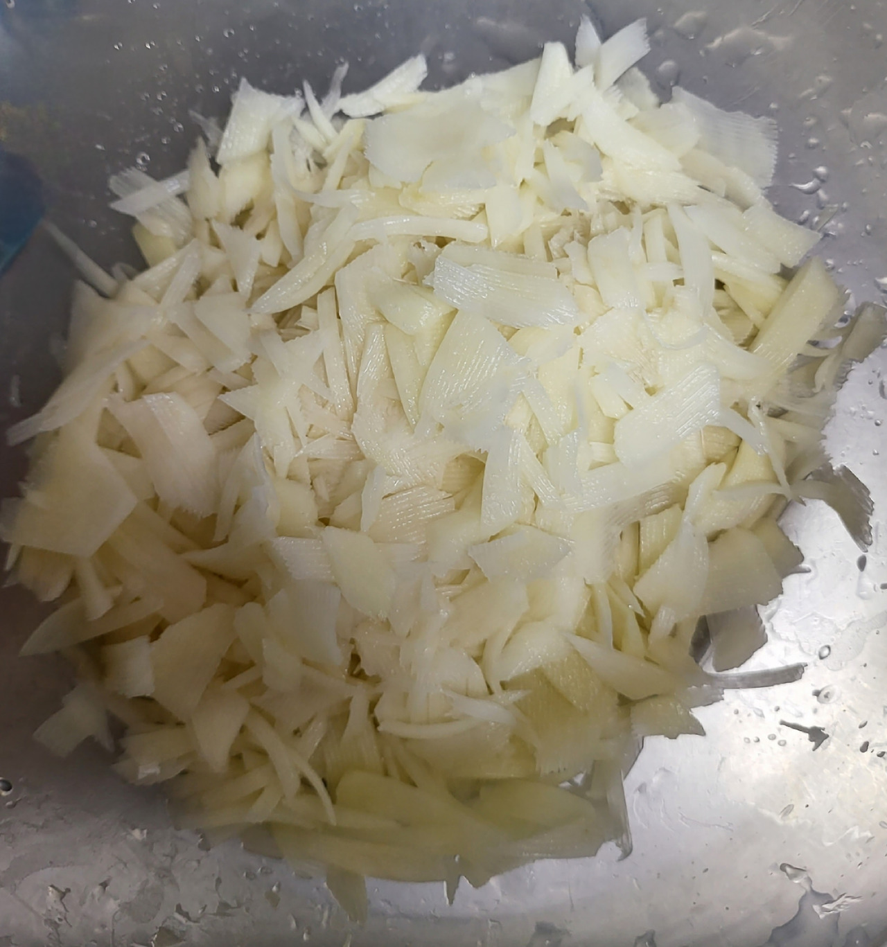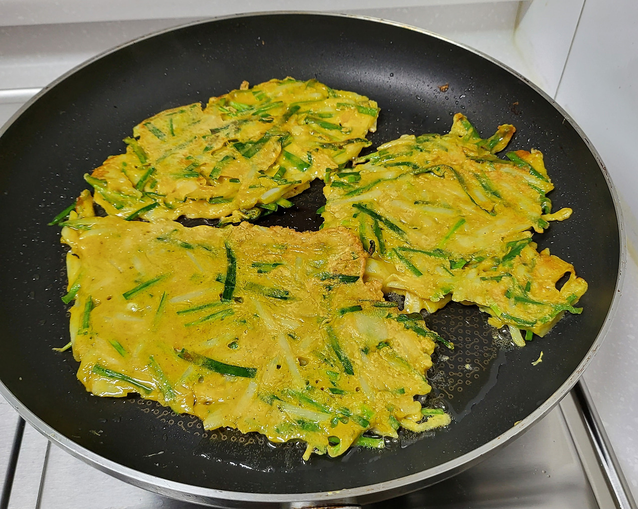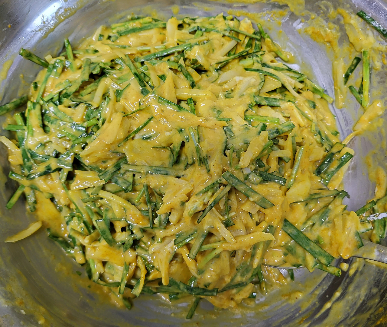 다음은, 부추를 씻어서 물기를 빼고 8cm 정도씩 잘랐다. 그것을 액젓으로 밑간해 두었다. 부추를 한쪽에 제쳐두고 감자채부추전을 부칠 참이었다. 내가 유튜브에서 본 것은 아무래도 번거로울 것 같았다. '감자를 갈아 녹말 물을 빼고 건더기만'이라는 부분이 쉬워 보이지 않았다. 그래서 감자채와 부추로 부침개 하는 레시피를 굳이 찾아봤다. 그 레시피대로 먼저 감자를 만능 채칼로 채 썰었다. 이어서 부추를 적당한 길이로 자른 후에 함께 섞었다. 여기서 신박한 팁이 있다. 반죽할 때 카레 가루를 넣는 것이다. 레시피에는계란을 넣는다고는 하지 않았지만 미리 깨뜨려 놓은 것이 있어서 함께 넣었다. 밀가루를 살살 가미하며 반죽을 했다. 이때 반죽의 정도가 매우 중요하다. 되직하다 싶을 정도로 하면 된다.