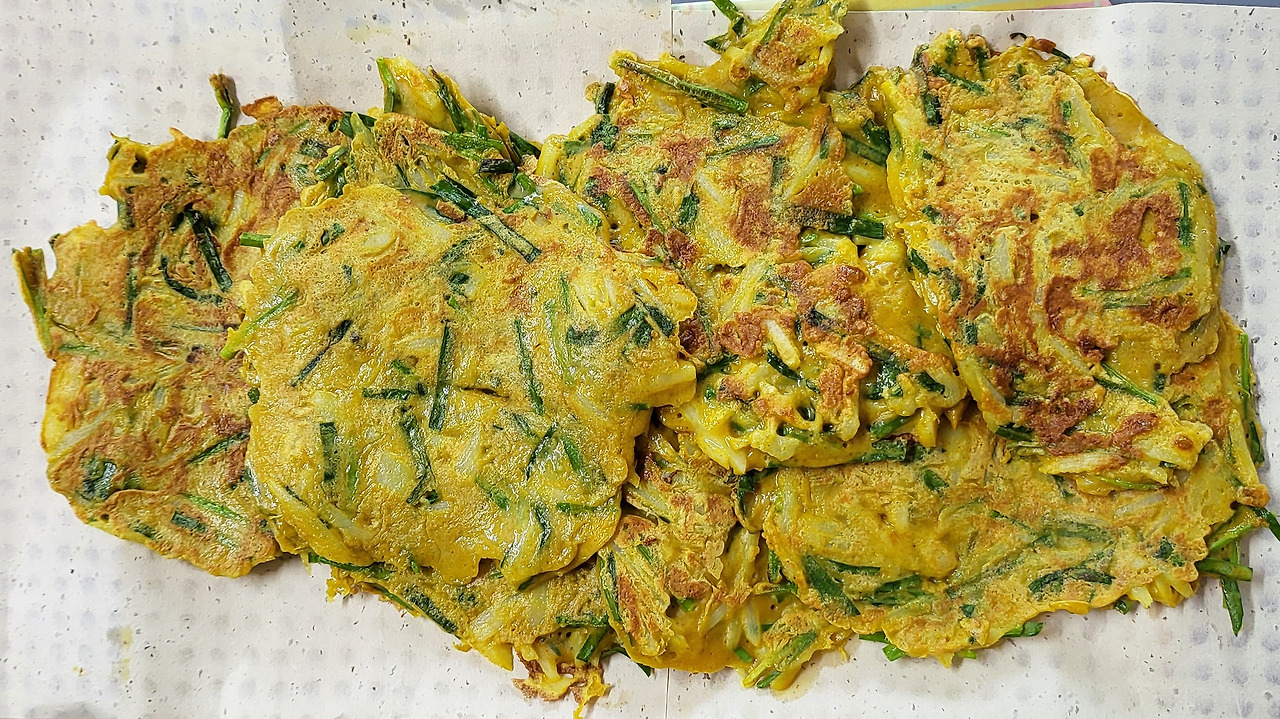 2교시 수업이 끝날 때쯤에 제2탄 요리, 감자채 부추전이 완성됐다. 맛을 봤다. 간을 본다는 핑계로 따뜻할 때 맛있게 먹었다. 카레 향에다 살살 씹히는 감자채의 식감을 어떻게 표현할 길이 없다. 이런 부침개는 처음 먹어본다. 양념간장이 필요 없었다. 간도 적당하고 느끼하지 않았기 때문이다.
