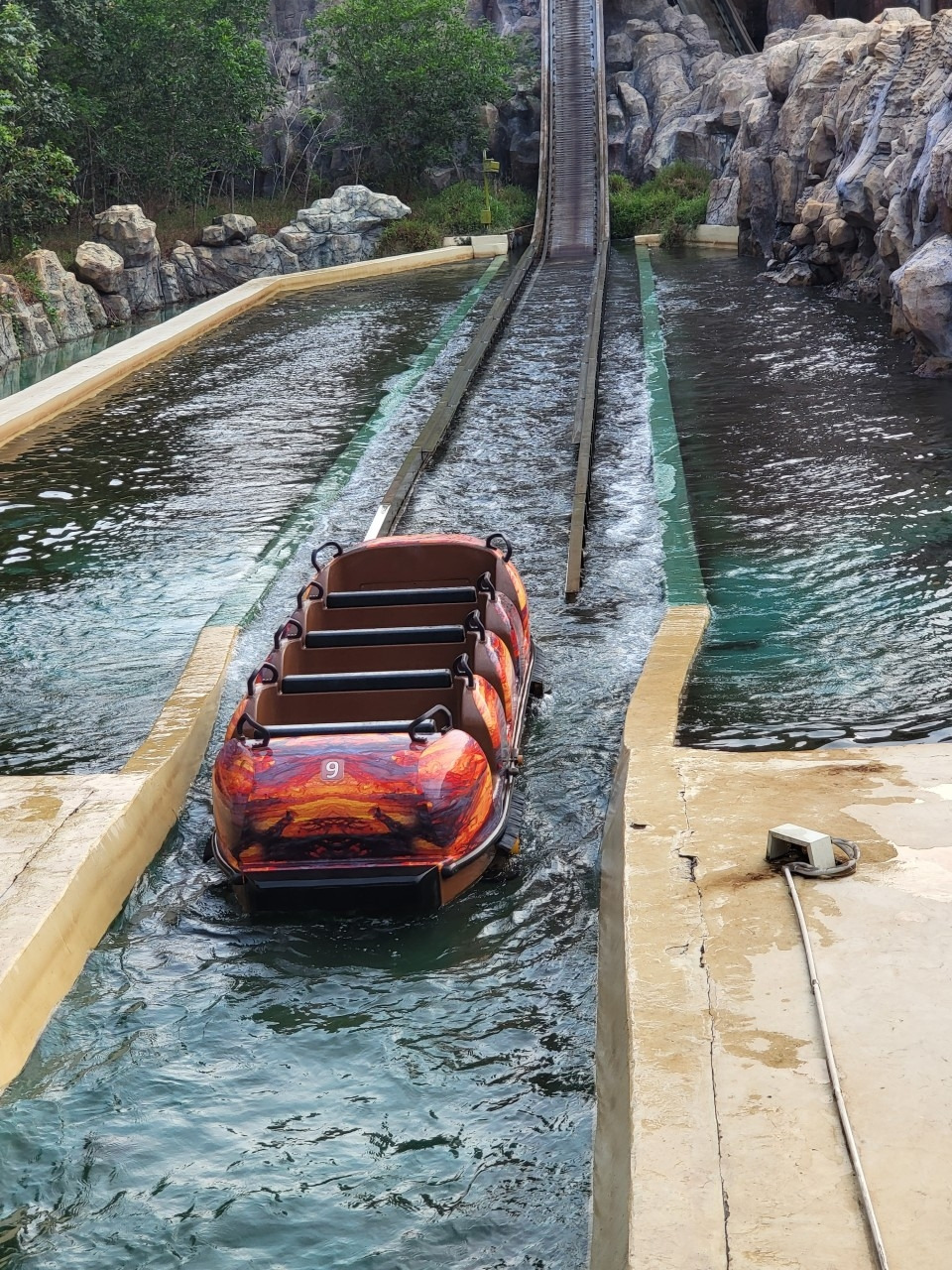 그다음 어트랙션은 바로 '아마존 볼케이노'였다. 입장하기 전에 볼케이노 보트를 타고 내려오는 사람들을 보니 하얗게 질려 있었다. 도저히 그것은 탈 자신이 없었다. 그 순간 이O우 의사 선생님의 얼굴이 떠올랐다. "안돼, 안돼. 심한 것은 안 돼요. 큰 일 나요."라던 말씀이 들리는 듯했다. 그래서 애당초에 깨끗하게 포기했다. 쫄보 같은 우리 일행은 무서움을 감추고 보트에 탑승하고 있었다. 관리 요원에게, 어디서 사진을 찍으면 좋으냐고 물었다. 그분이 친절하게 사진 찍을 수 있는 곳으로 안내해 주셨다.