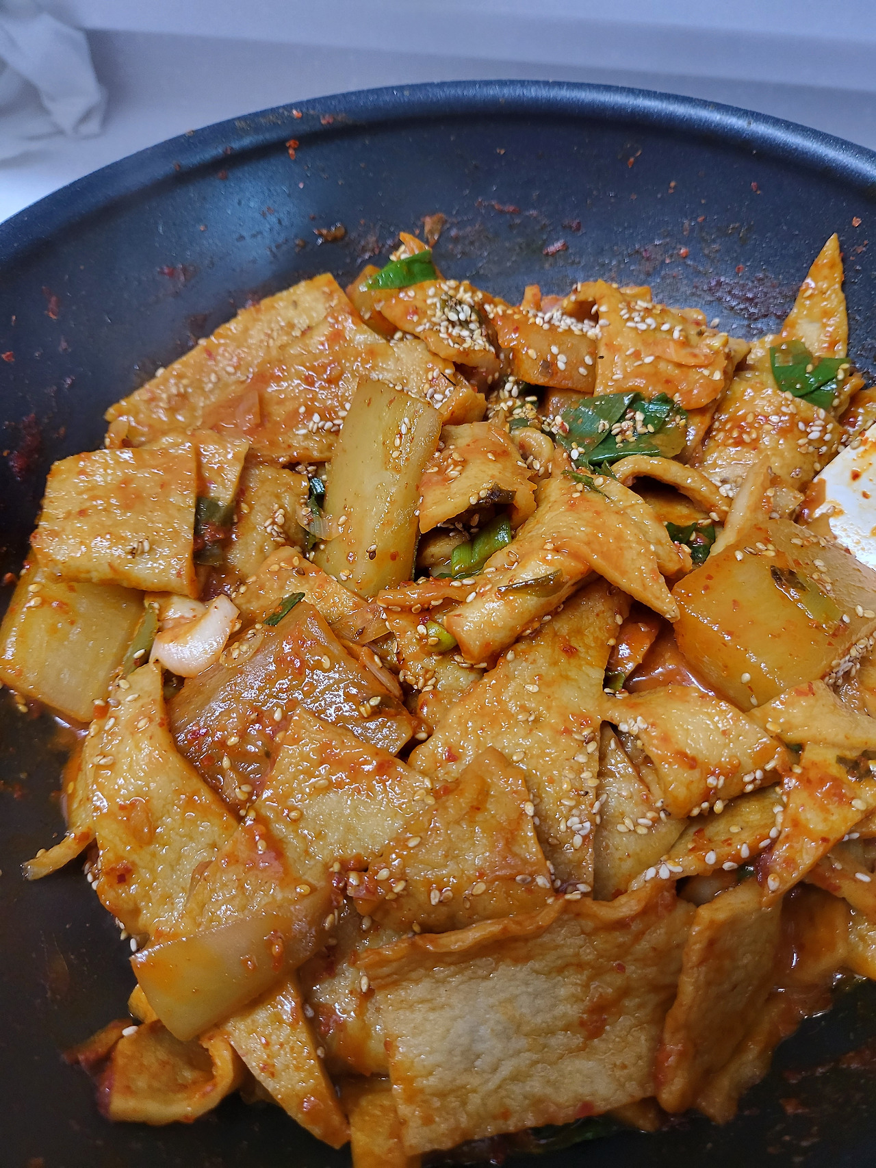 [무 조림 양념으로 오뎅 볶음을 하고 있다.]