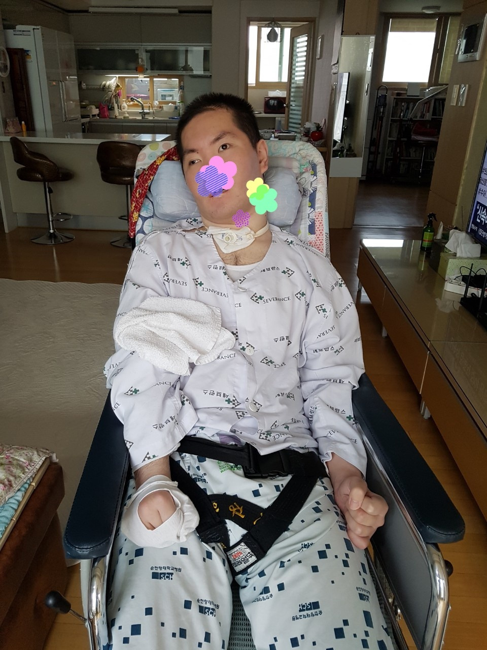 남편은 여자와 팔씨름에 진 이후에는 꼭 변명을 했었다. 남편이 아들의 바지춤을 잡고 안으면 누군가 아들의 다리를 붙들고 호흡을 맞추어서 휠체어에 싣고 내리는 일을 했었다. 재활 요양병원에서 엄지척할 만한 것을 만났다. 바로 '샅바'였다. 어떤 분이 아내를 간병하면서 고안해낸 것이었다. 엄밀히 말하면 샅바도 아니다. 그것은 아직 제 이름이 없다. 태권도 벨트를 몇 개 붙여서 허리춤과 두 다리에 걸은 후에 뒤에서 그걸 지탱하여 잡고 환자를 끌어 안으면 들어올리기가 편한 획기적인 효자 제품이다. 지인에게 부탁하여 태권도 벨트를 구했다. 큰 바늘을 사용하여 그 제품을 만들었다. 누군가에게는 걸레 조각에 불과하지만 남편과 아들에게는 없어서는 안 될 매우 요긴한 보물이다. 두 개를 번갈아가면서 사용하고 있다. 매일 6회 정도는 들고 내려야 하는데 샅바가 큰 도움이 되고 있다. 그것이 없었더라면 남편은 몇 번이나 허리가 나갔을 것이고 통증으로 물리치료실을 다녀야 했을 것이다. 그것을 8년째 사용하고 있지만 짱짱하여 낡지도 않는다.