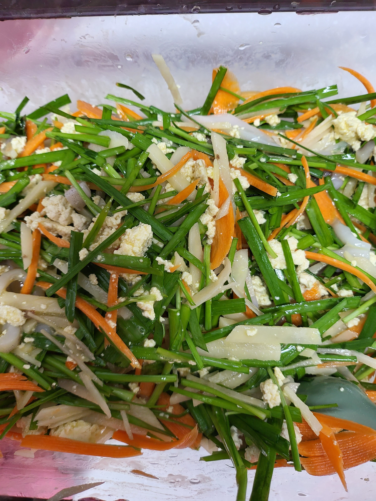 이 부침개는 부치는 과정이 야채전과는 사뭇 다르다. 으깬 두부를 볶아서 팬에 먼저 깔고 그 위에 부추를 올린다. 그 위에 계란물을 끼얹어 부치는 것이다. 한 면이 다 익으면 접시로 팬을 덮은 후에 팬을 뒤집는다. 그러면 부침개가 접시로 이동한다. 그 상태로 접시에 있는 부침개를 팬으로 옮겨 다른 쪽을 익힌다. 이 과정은 상당한 기술이 필요하다. 이렇게 부친 '부추, 두부 부침개'는 계란말이 보다 영양 면에서 더 좋다. 또한 야채전과는 다른 맛이다. 밀가루가 가미되지 않았으니...